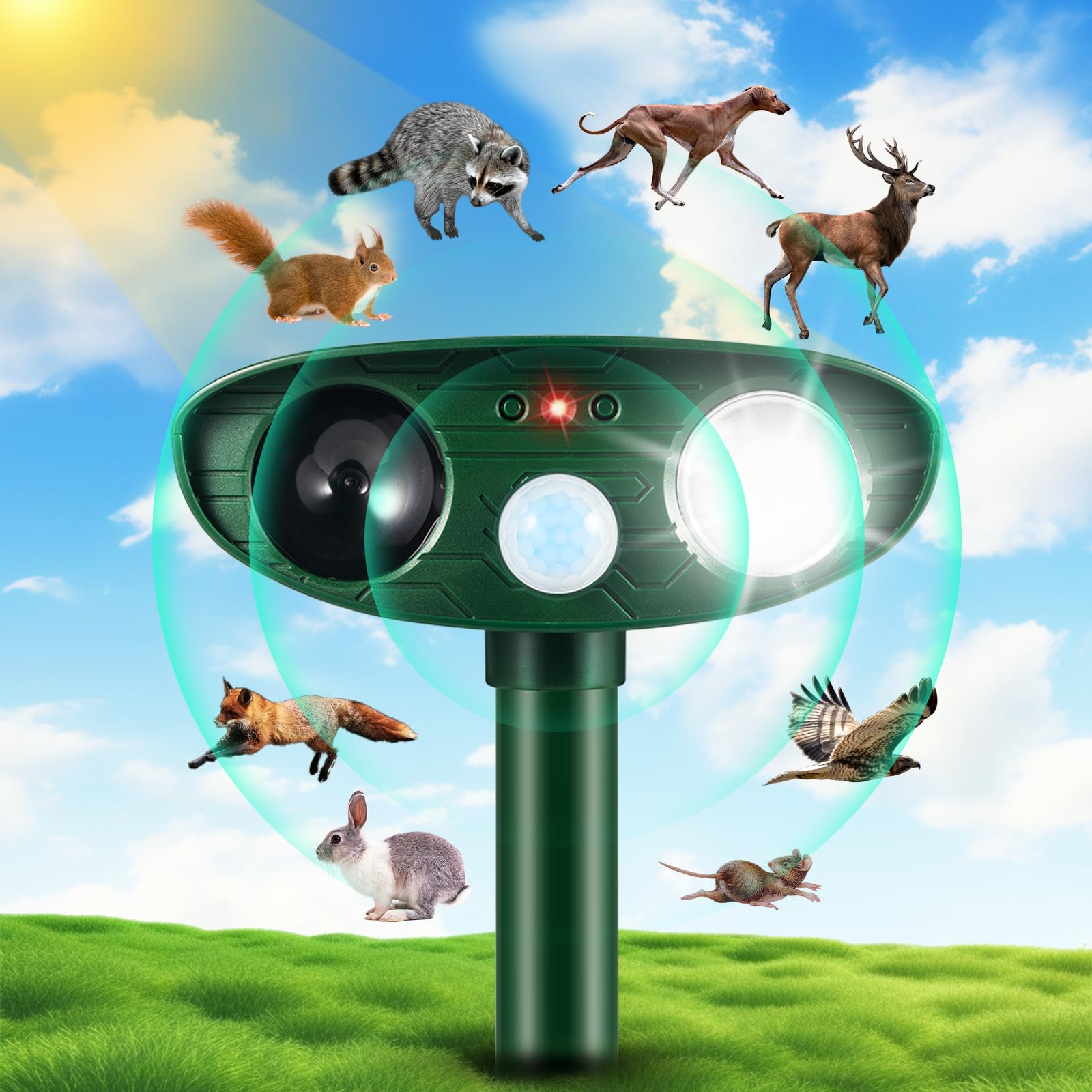 Repelente de animales ultrasónico para exteriores, dispositivos repelentes de ciervos, repelente solar de animales con sensor de m