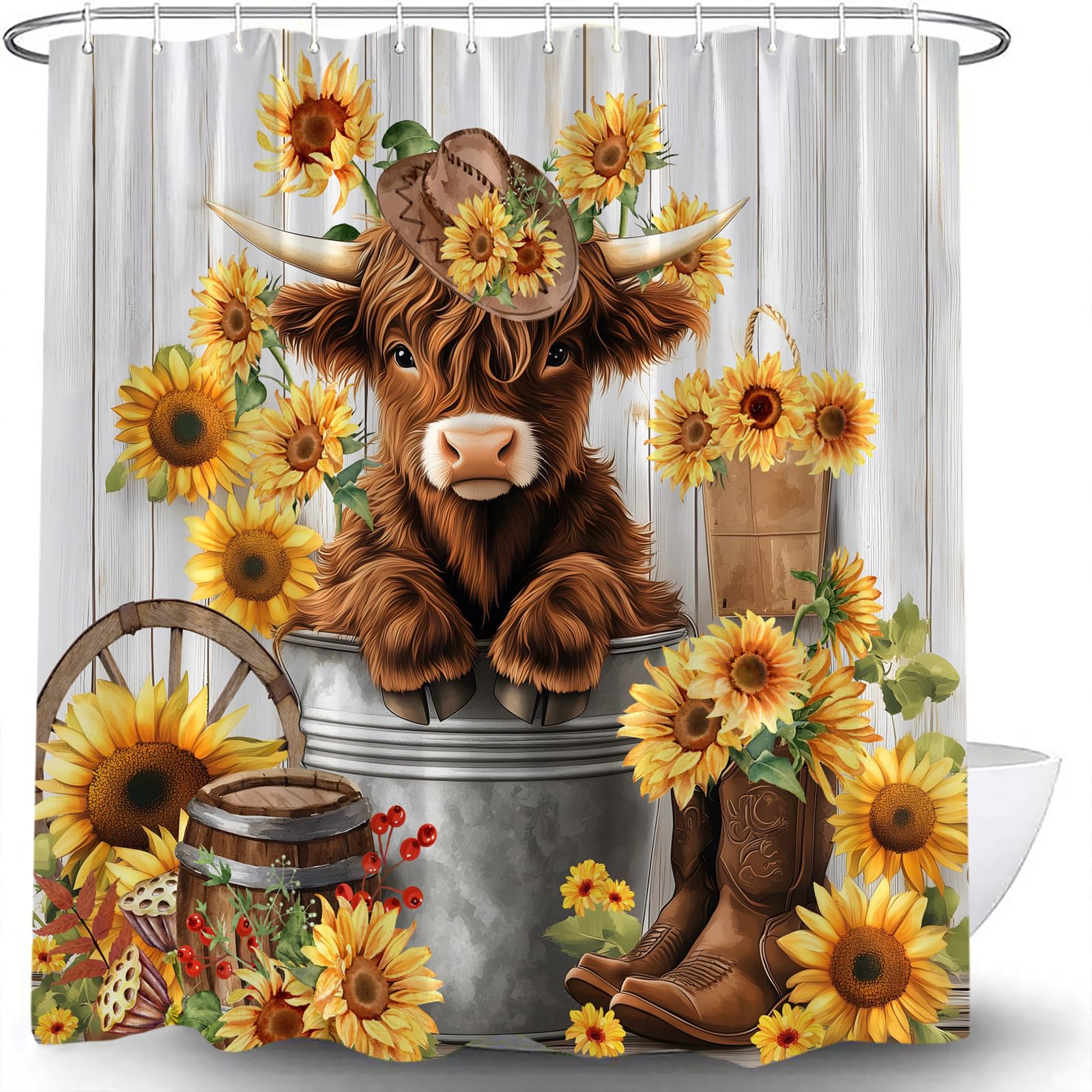 Cortina de ducha con diseño de vaca de las tierras altas, diseño rústico de girasol, ganado de madera, zapatos de vaquero occident