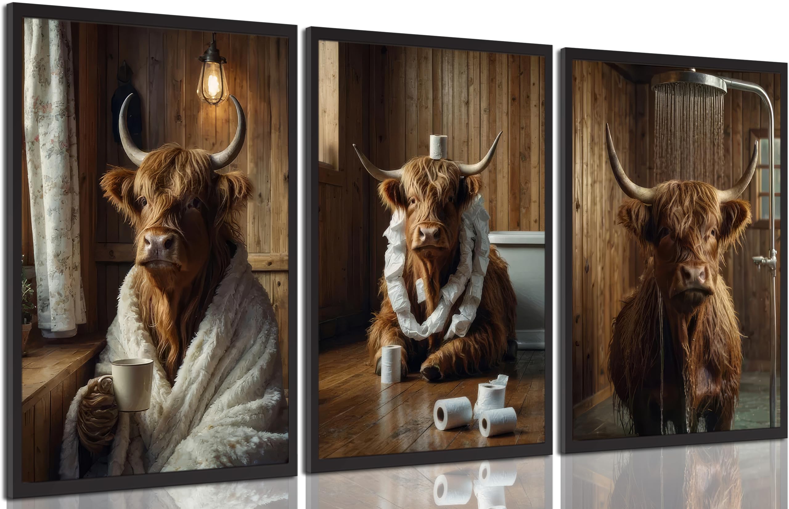 3 piezas divertidas de vaca de las tierras altas para baño, decoración de pared de baño, imagen de ganado marrón, estilo rústico,