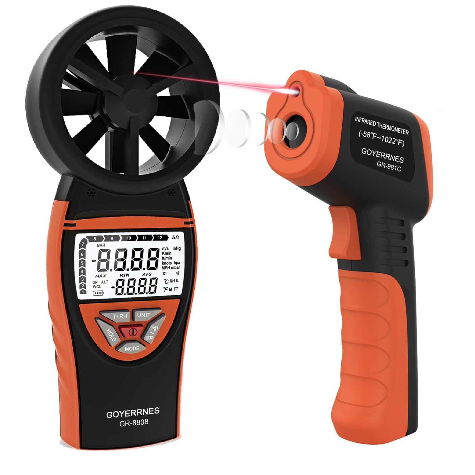 Anemómetro de mano para humedad de temperatura de velocidad del viento, termómetro infrarrojo sin contacto -58 a 1022℉