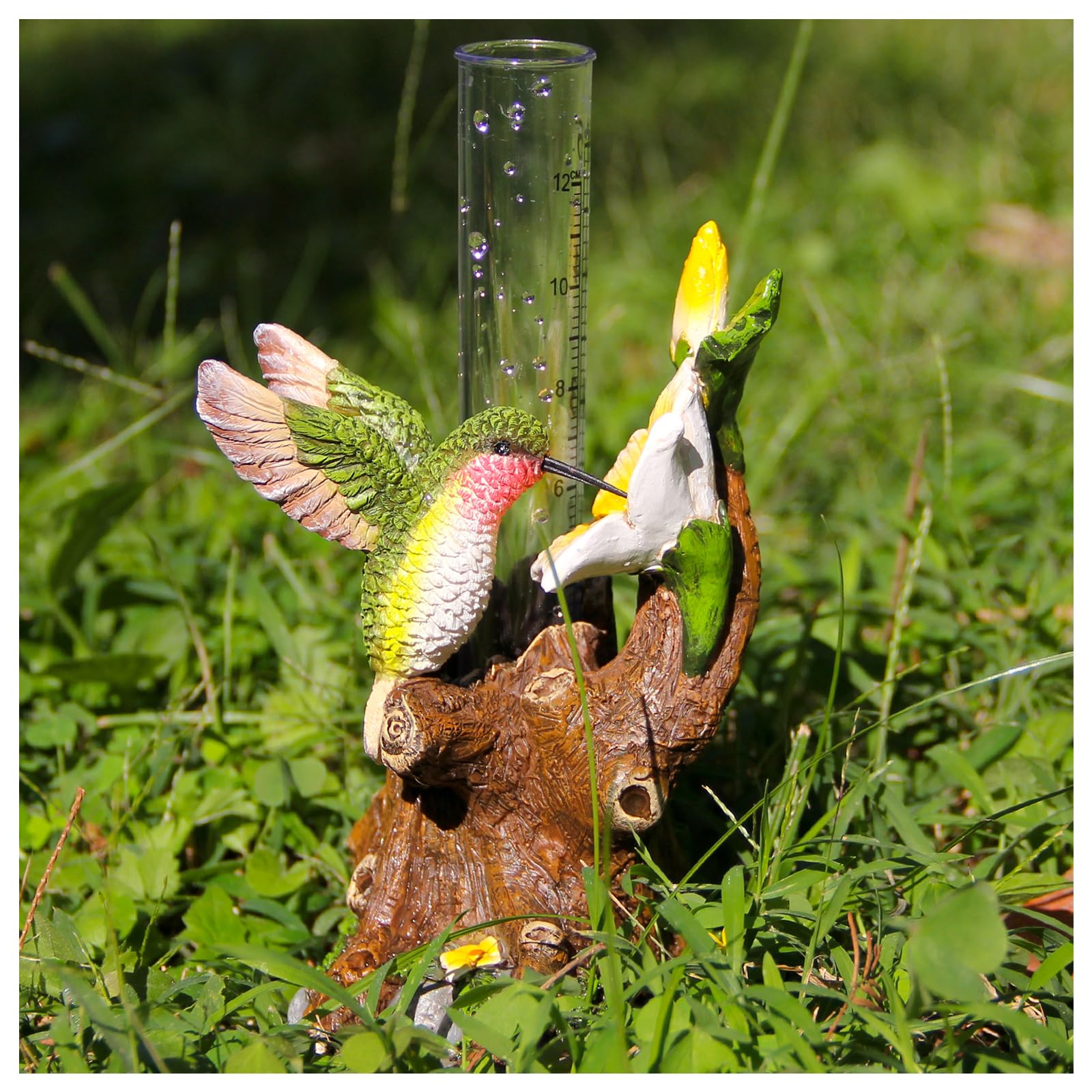 Medidores de lluvia de colibrí para exteriores, estatua de jardín de colibrí de resina con un medidor de lluvia de plástico, escul