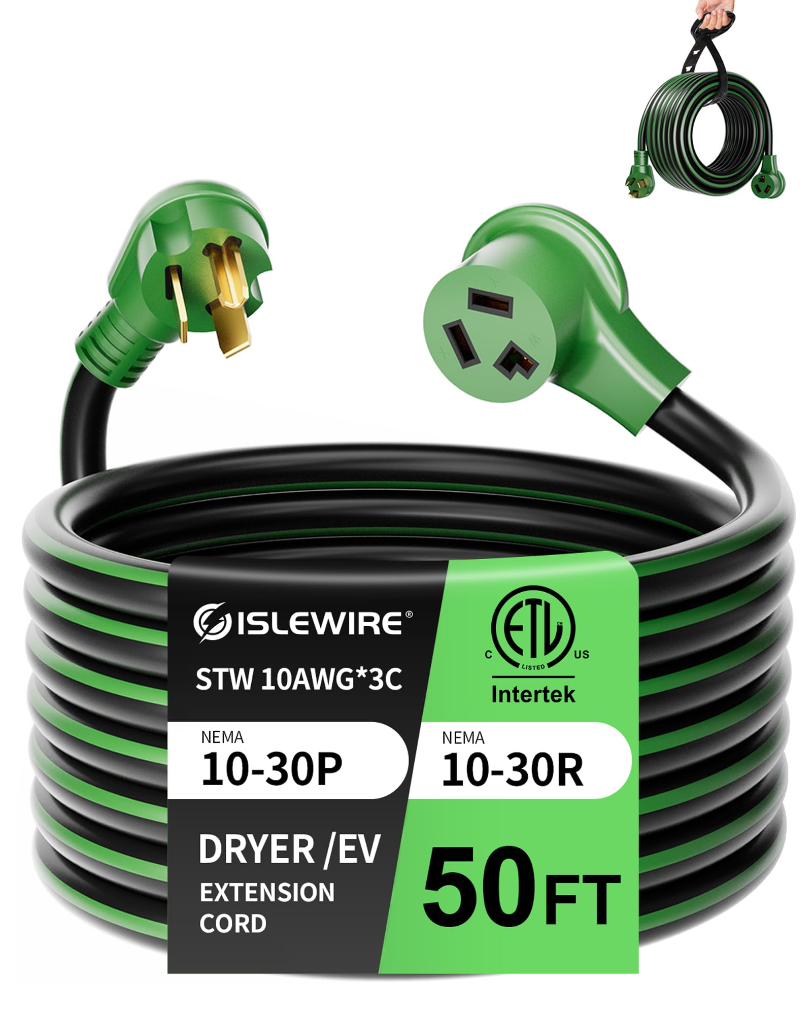 Cable de extensión de 3 clavijas para secadora de 30 amperios, 50 pies, NEMA 10-30P a 10-30R, calibre STW 10 resistente de 125 V/2