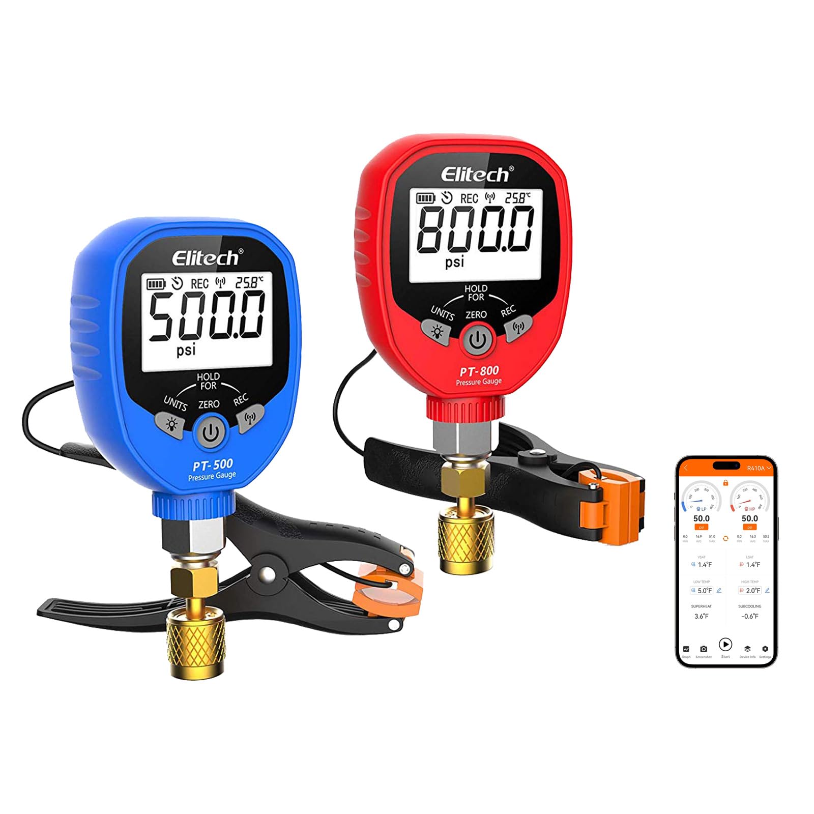 Elitech Digital AC Gauge Set HVAC Medidores APP Monitoreo con abrazaderas de temperatura 1/8 ” NPT, PT-500 y PT-800