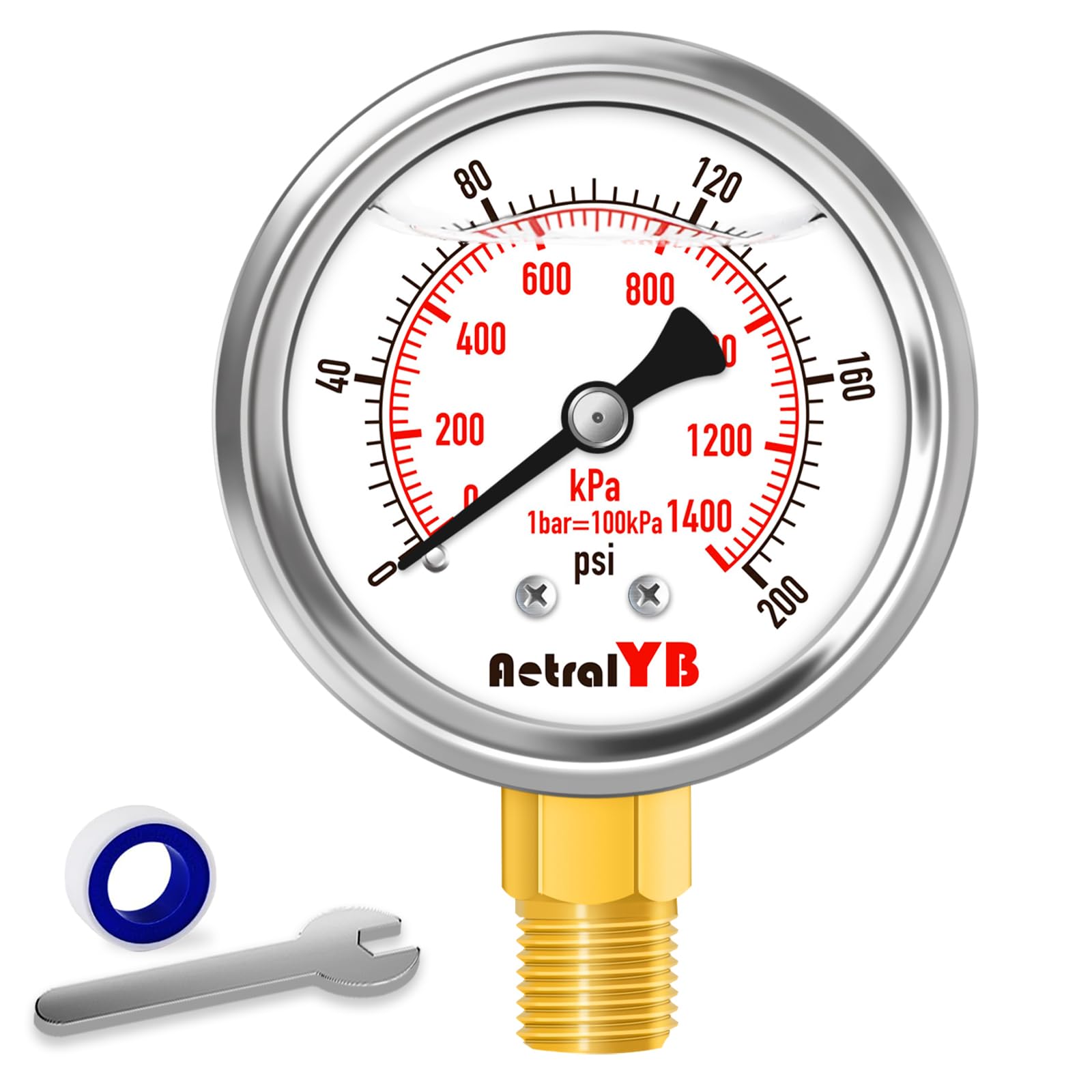 Medidor de presión de 200 psi, tamaño de dial de 2 pulgadas, montaje inferior 1/4 NPT, impermeable, caja de acero inoxidable, para