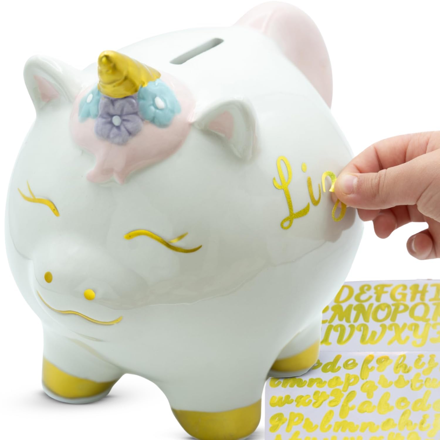 Hucha de unicornio para niños, alcancía de cerámica pintada a mano para niñas con enchufe, juguete de unicornio personalizado para