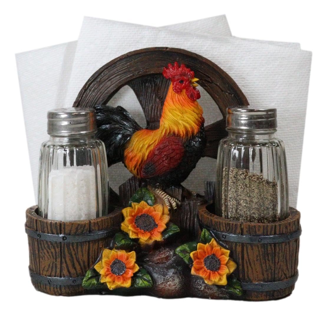 Ebros Gift Country Farm Orgulloso Gallo por girasoles Barril de madera y rueda de carro, Servilleta y salero y pimentero, figurita