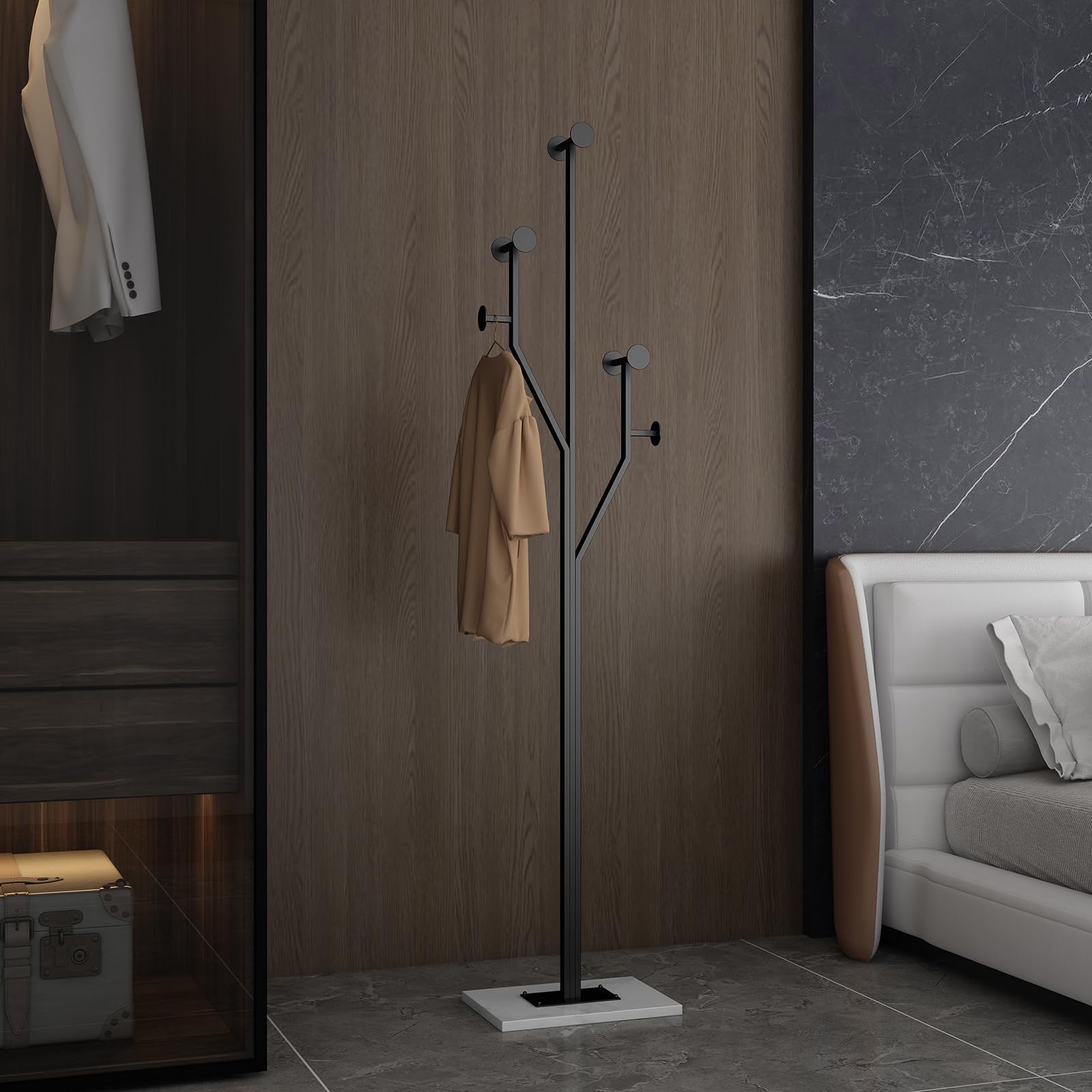Perchero resistente de metal en forma de árbol con base de mármol resistente, perchero esquinero para dormitorio, entrada, pasillo