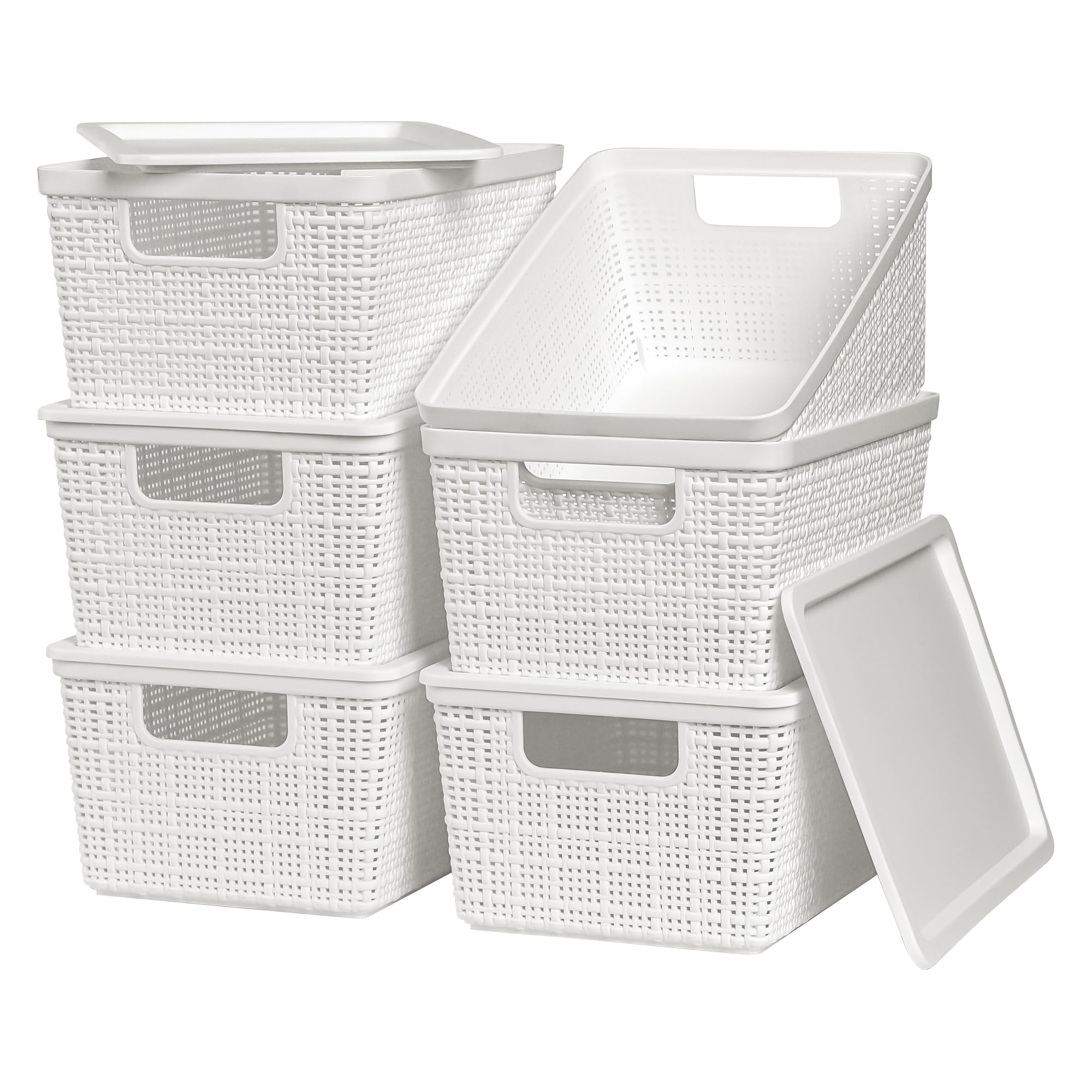 Paquete de 6 cestas de almacenamiento de plástico con tapas, contenedores de almacenamiento apilables transpirables blancos, peque