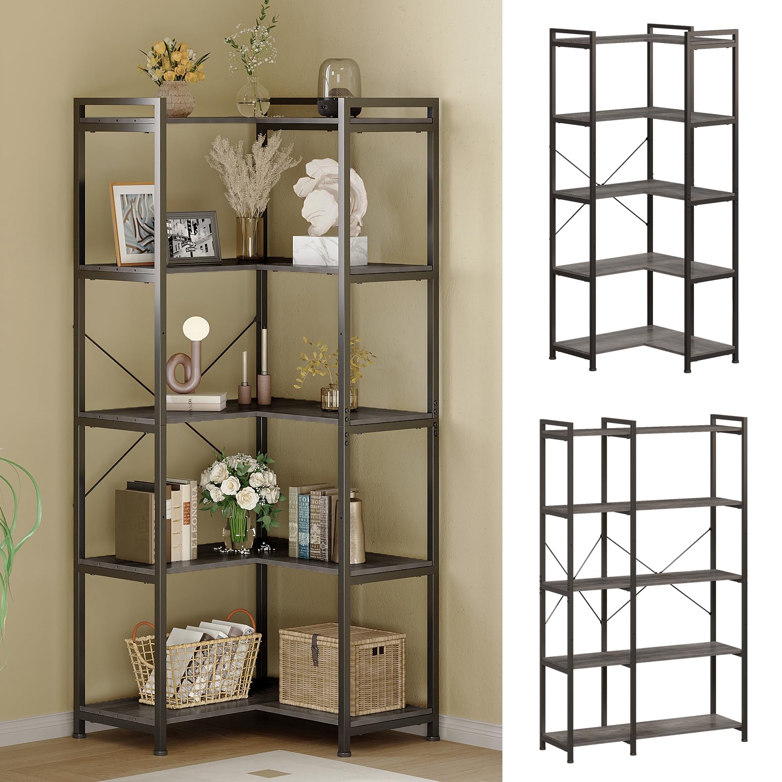 Tohomeor Estantería esquinera deformable de 5 niveles, de pie, moderna, industrial, para dormitorio, sala de estar, sala de estudi