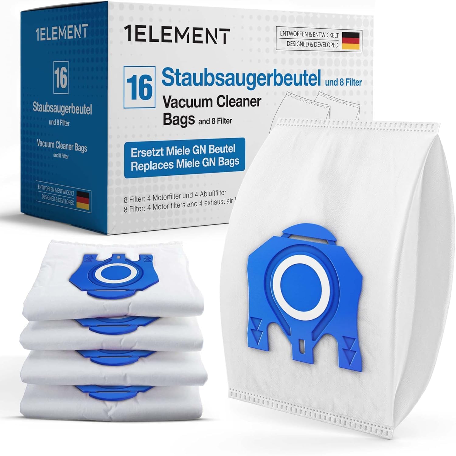 16 bolsas de vacío [Reemplaza Miele GN] – Compatible con Miele [Classic C1, C2 completo y C3] – Incluye 4 filtros de motor y escap