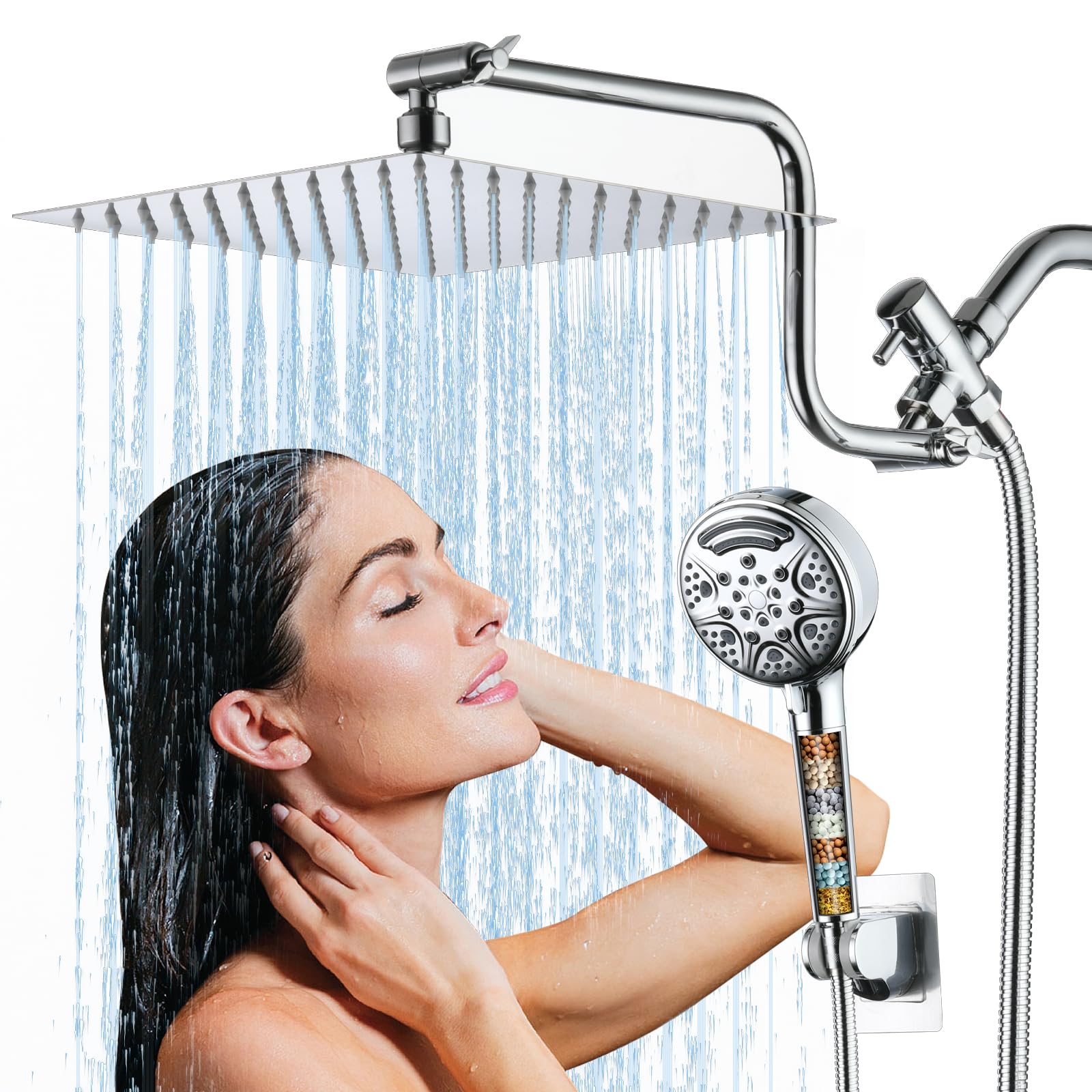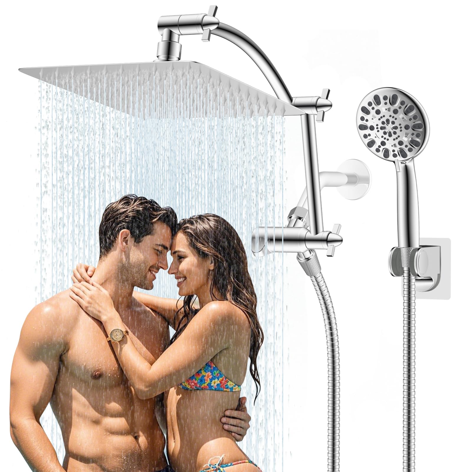 Cabezal de ducha de metal de 8 pulgadas, cabezal de ducha cuadrado doble con varita de mano de 71 pulgadas, juego de cabezales de