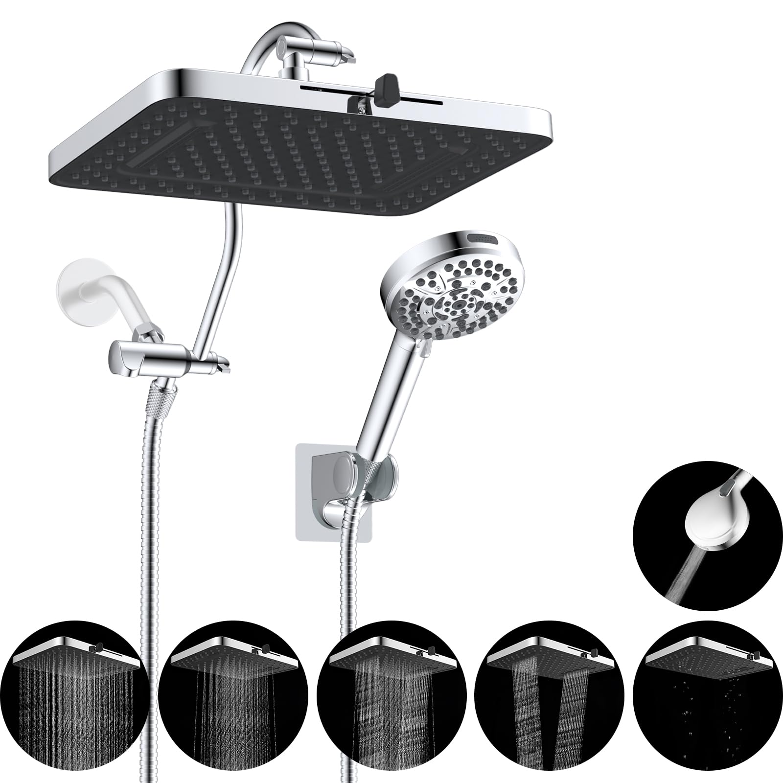 Hibbent Cabezal de ducha mejorado de 5 pulverizaciones de 13 pulgadas, cabezal de ducha de alta presión, combo de cabezal de ducha