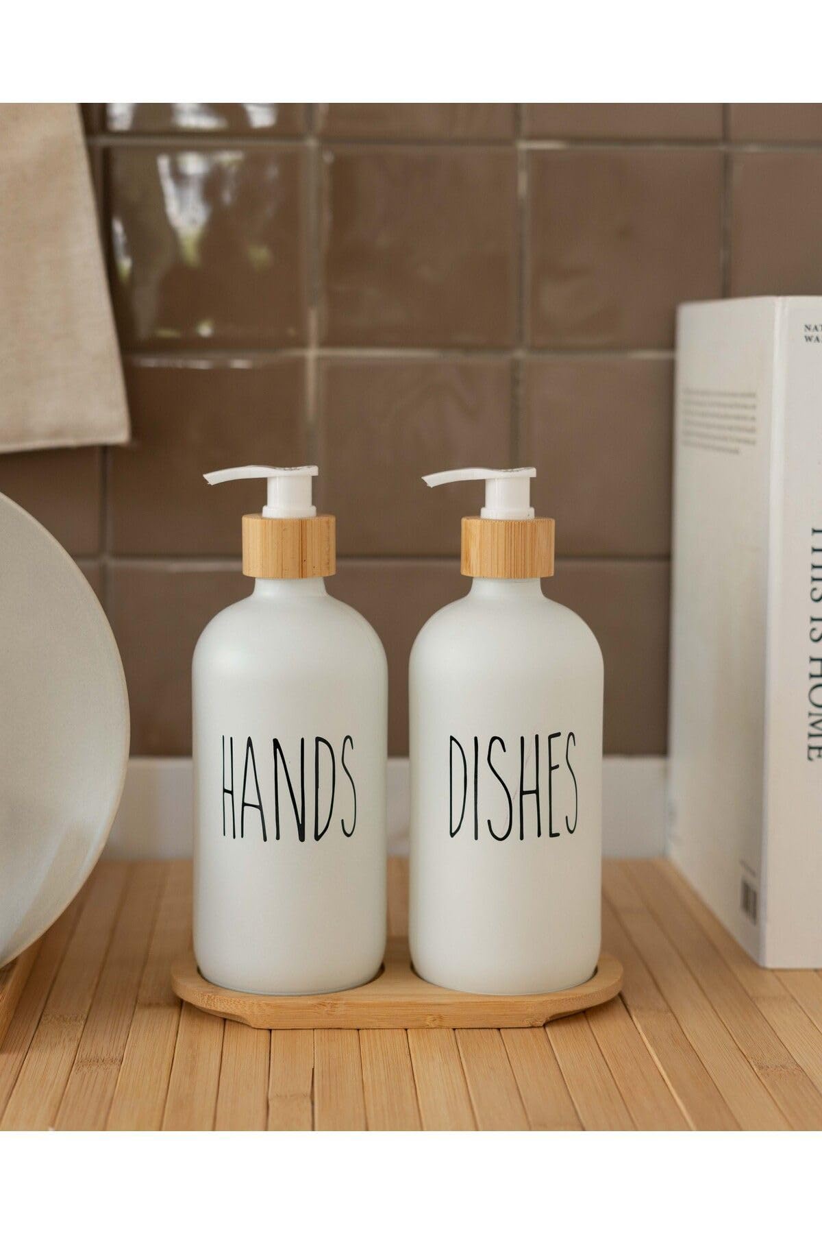 KARO Daily – 2-Pack Glass Soap & Dishwasher Dispenser Set with Wooden Tray – Durable, Refillable Pump Bottles for Kitchen Sink or