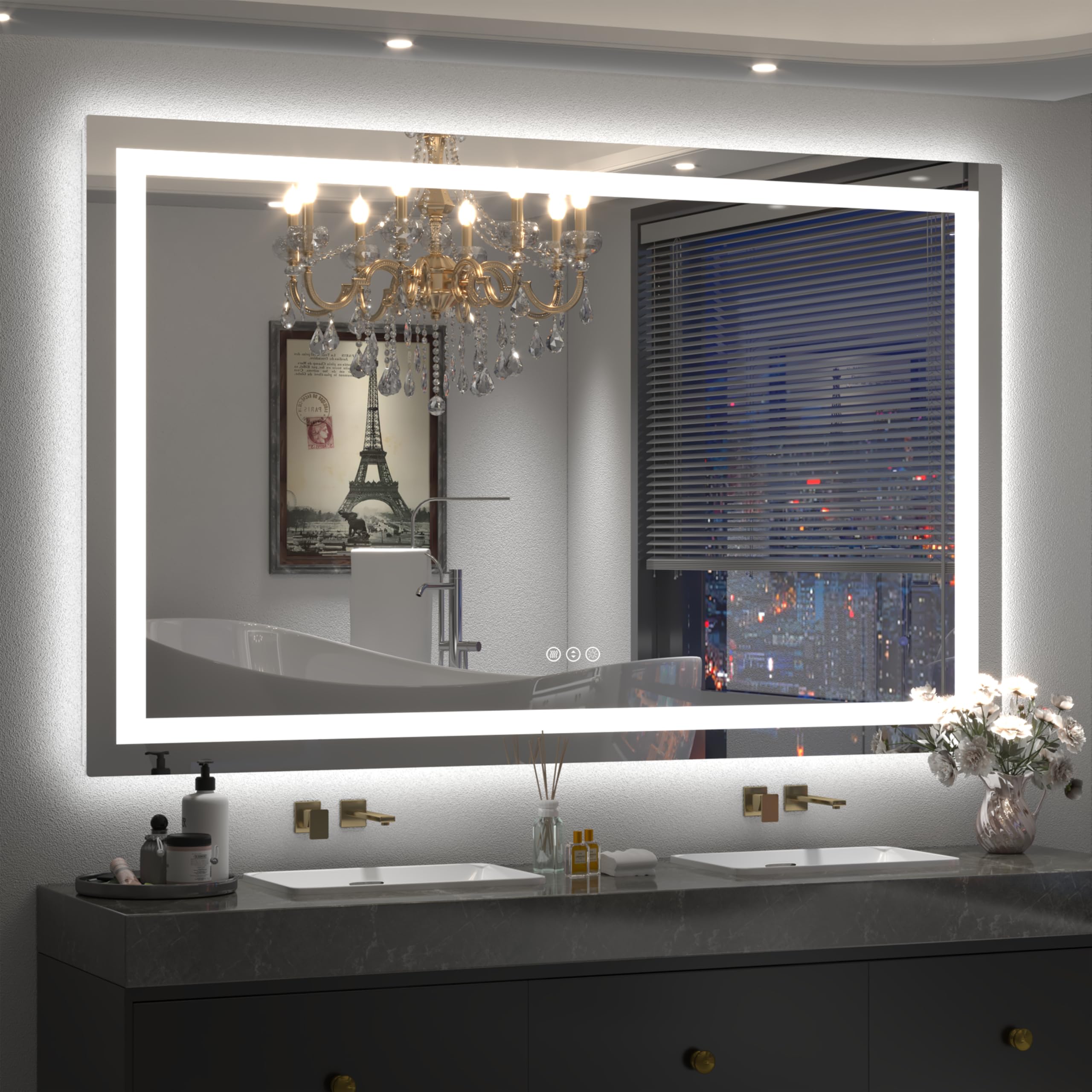 Espejo de baño LED de 57 x 36 pulgadas, espejos de tocador iluminados para pared, luces delanteras y retroiluminadas, regulable, a