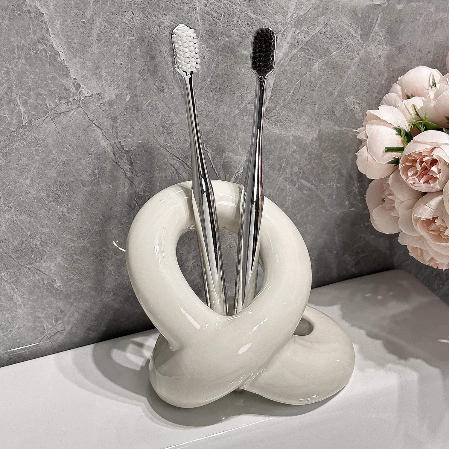Toothbrush Holder Ceramic Rope Knots Stand for Toothbrushes, Makeup Brushes, Pens Storage Holder for Bathroom Vanity and Counterto
