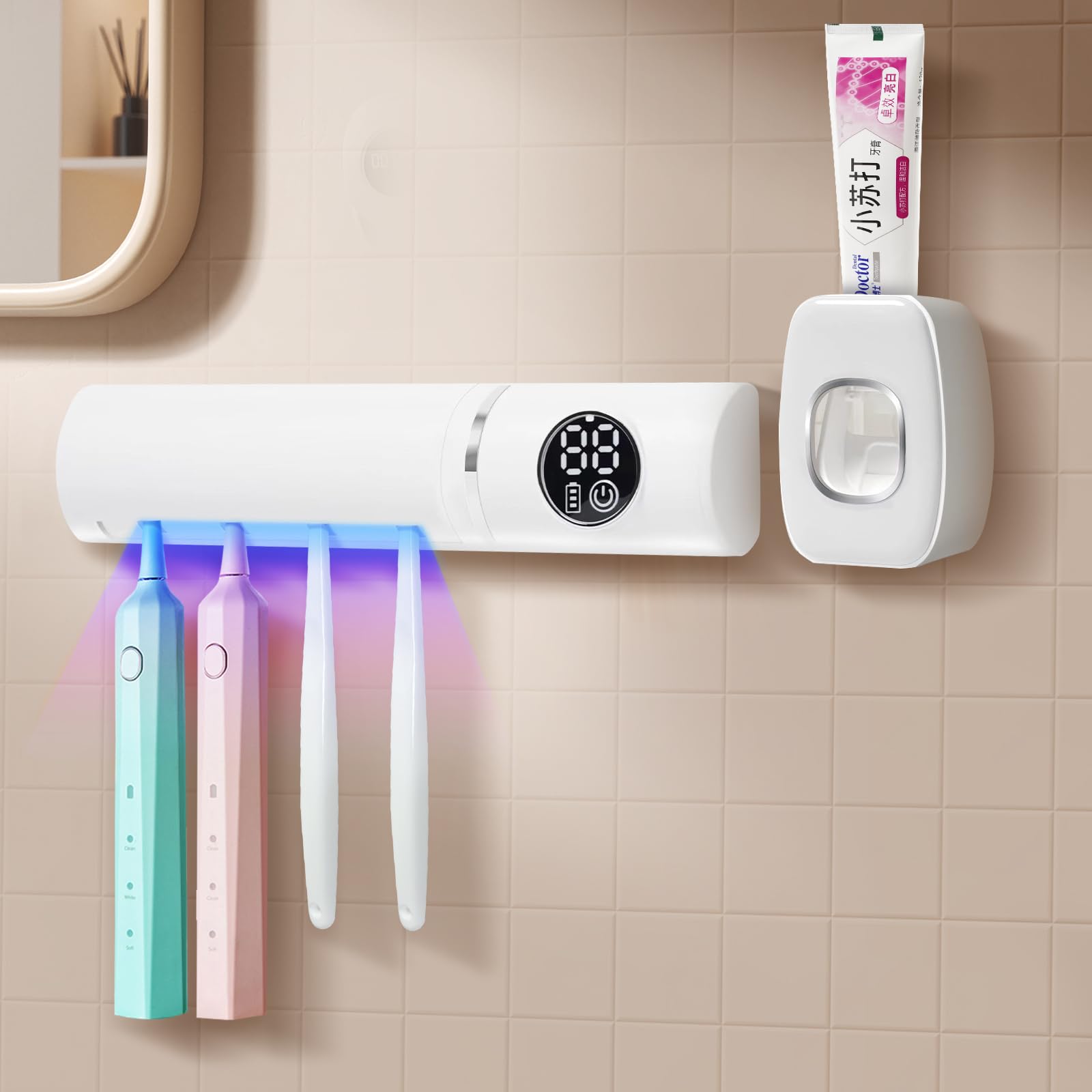 Porta cepillos de dientes y exprimidor automático de pasta de dientes, limpiador de cepillos de dientes con secado y pantalla digi