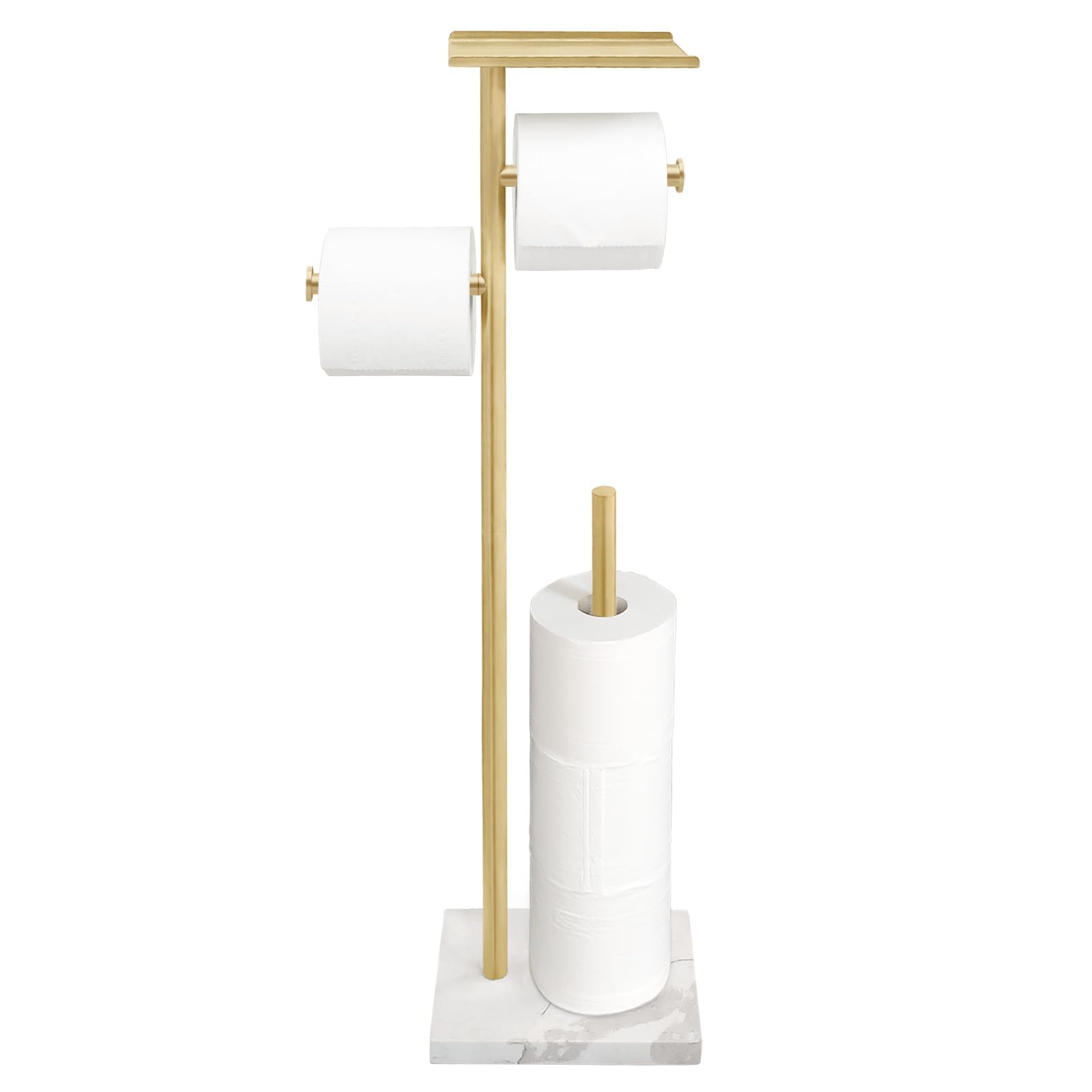 Brushed Gold Toilet Paper Stand Holder with Shelf, Marble Design Base Free Standing Toilet Paper Roll Holder with 2 Dispenser SUS
