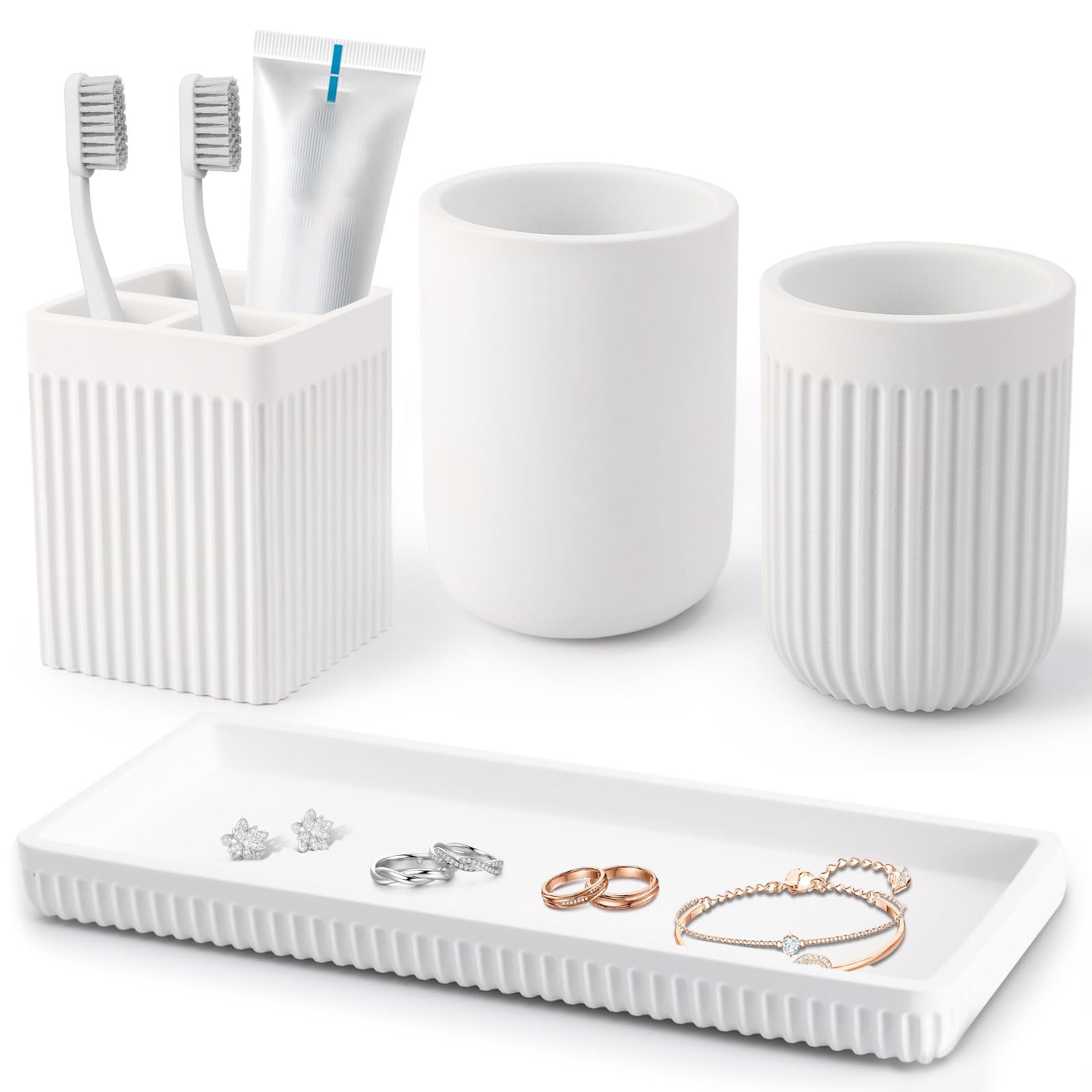 Juego de 4 soportes de resina para cepillos de dientes, color blanco mate, juego de 4 piezas, vaso de baño con bandeja, para frega