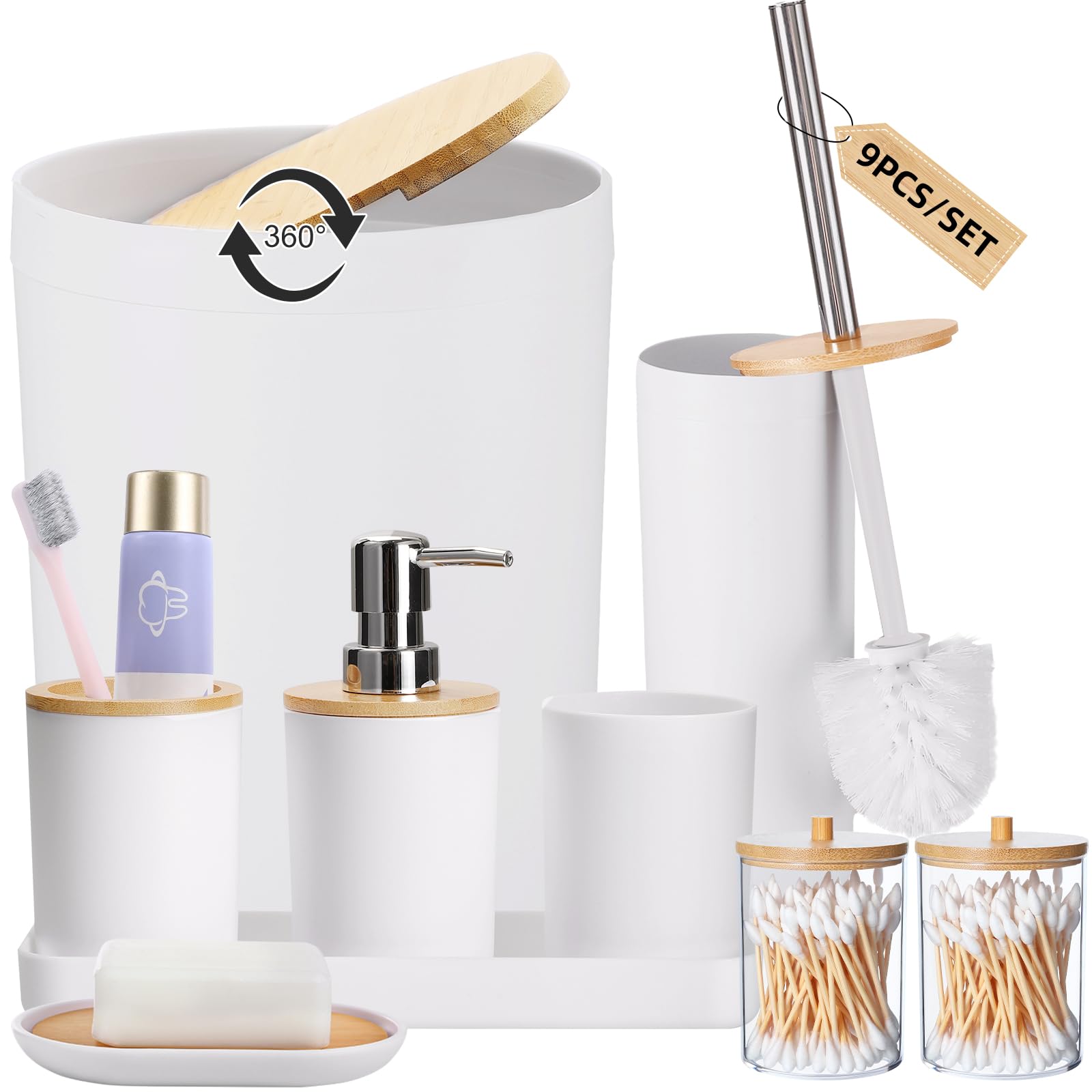 SLDIYWOW Juego de 9 accesorios de baño blancos con basura, bandeja, dispensador de jabón, soporte para cepillos de dientes, vaso p