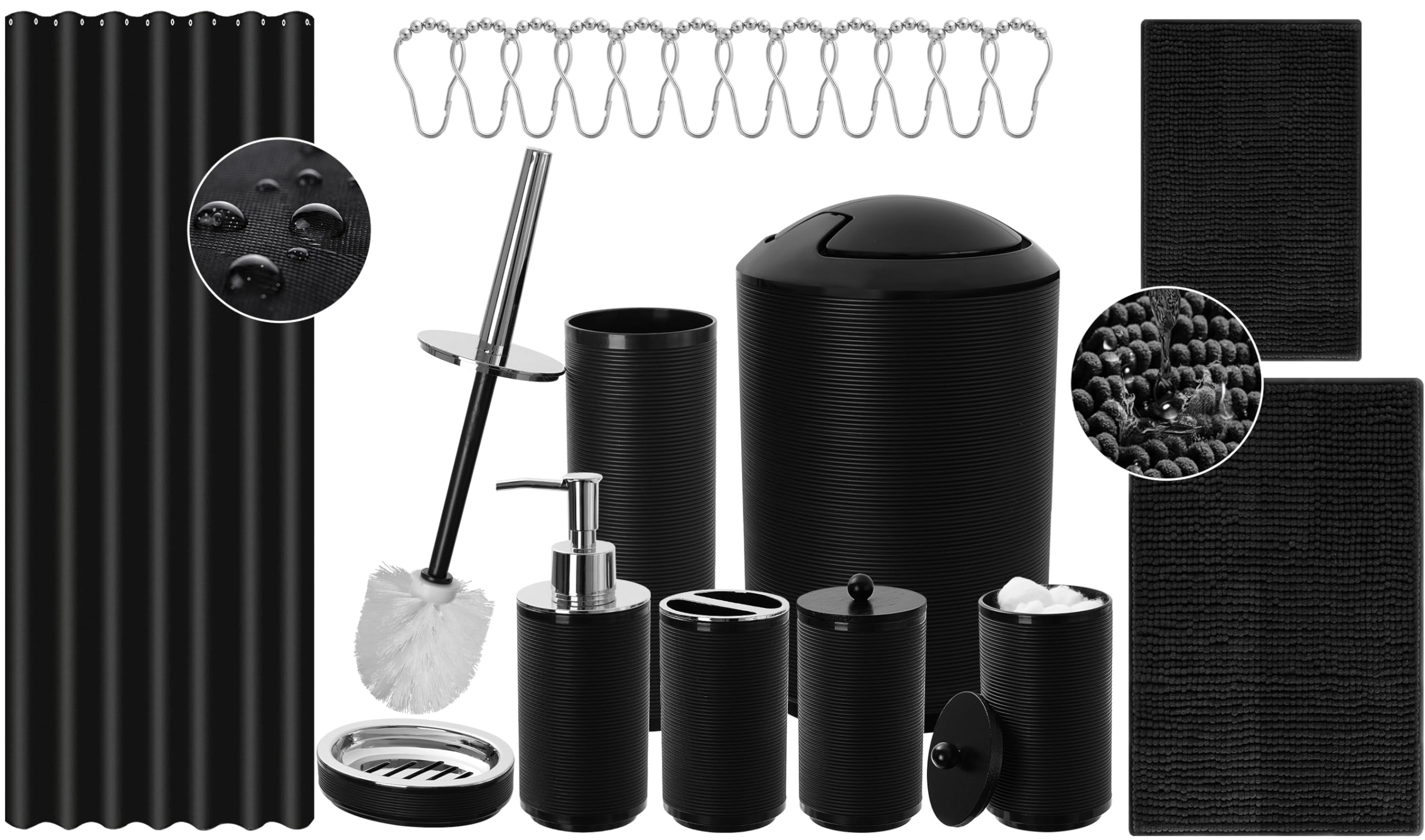 Juego de accesorios de baño negros con cortina de ducha y alfombras, juego de 22 piezas de accesorios de baño completo con basura,