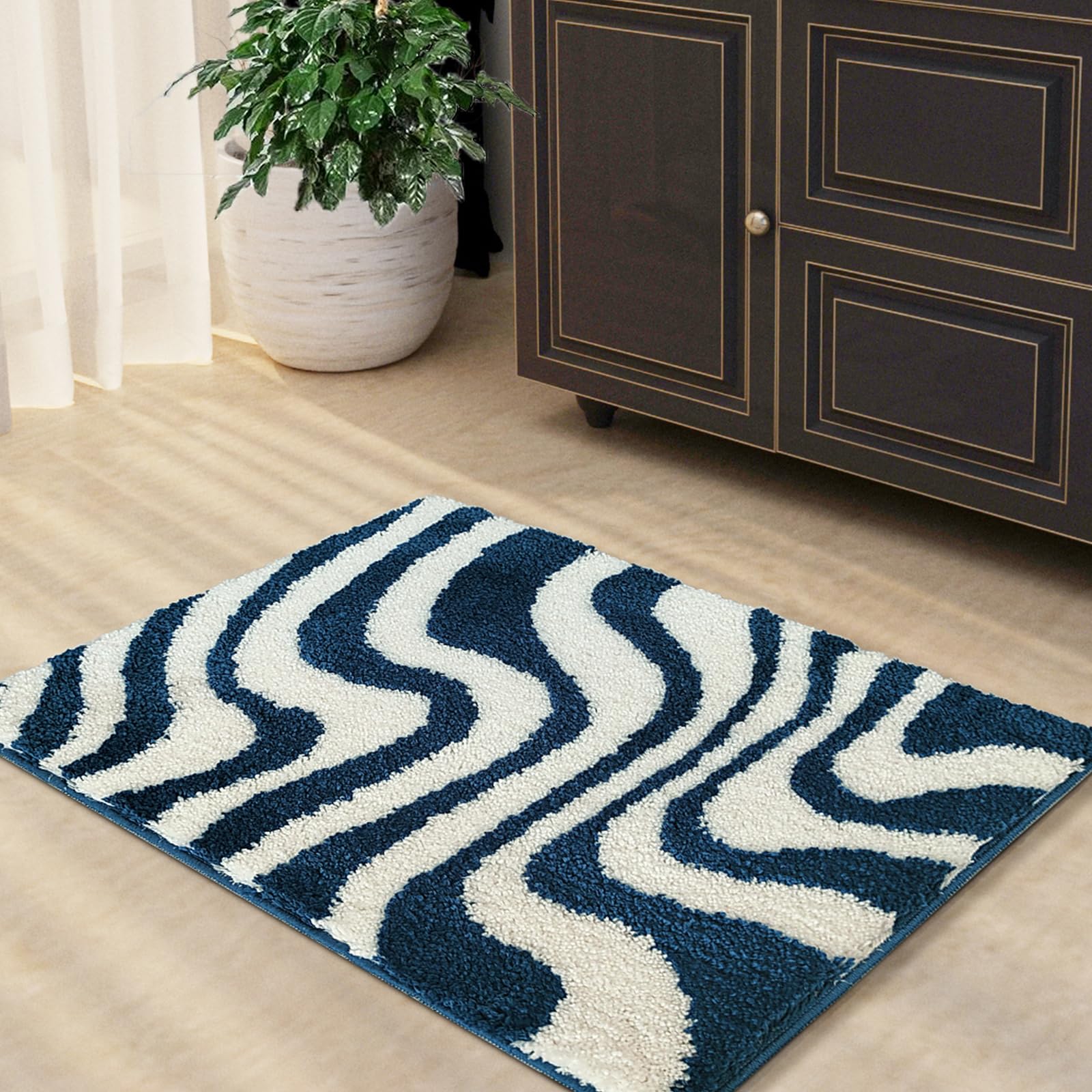 Civkor Alfombra de baño para baño, color azul y blanco, alfombra de baño de microfibra con respaldo antideslizante de caucho termo