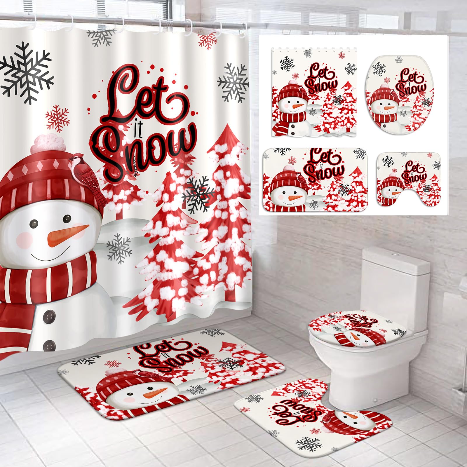 4 Pcs Christmas Snowman Shower Curtain Sets with Non Slip Rugs Toilet Lid Cover Bath Mat and 12 Hooks Let It Snow Winter Snowman B