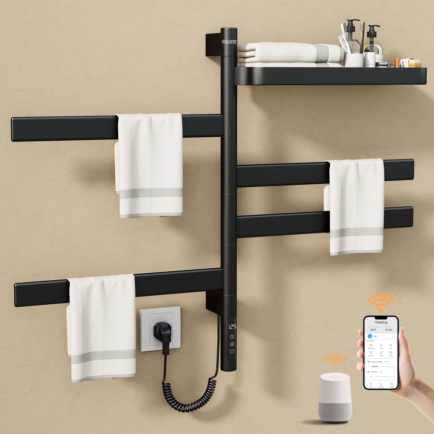 ENZE Toallero calefactable giratorio inteligente para baño, secador de toallas eléctrico montado en la pared con barras giratorias