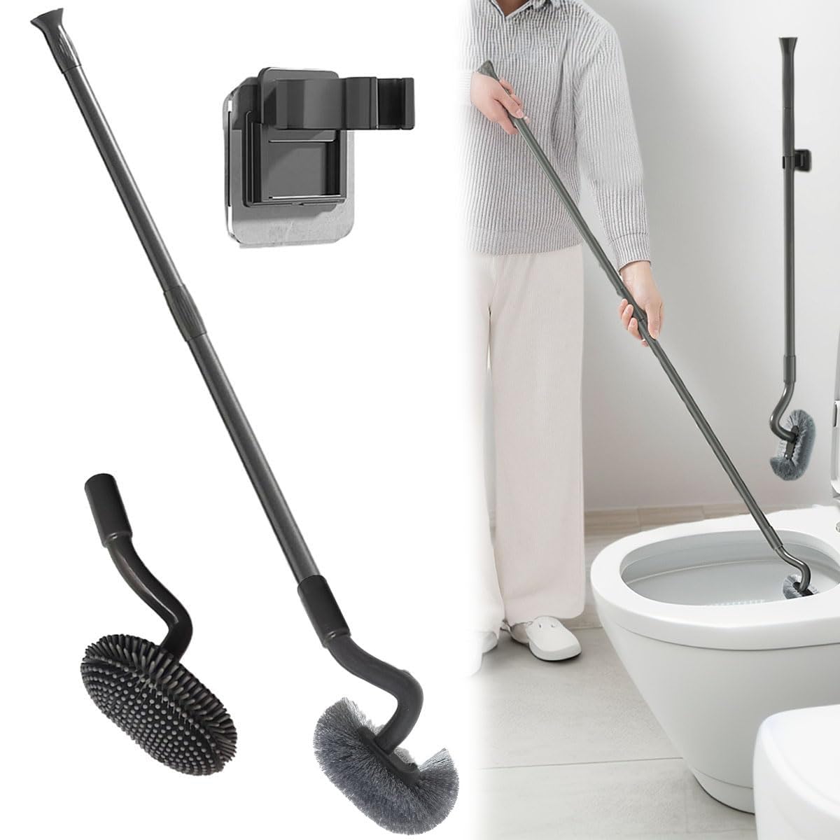 Juego de cepillos de inodoro de mango largo montado en la pared con soporte y 2 cabezales de cepillo de silicona y cerdas rígidas