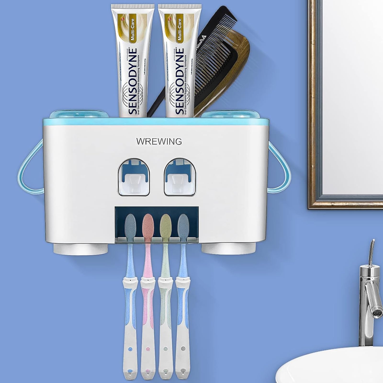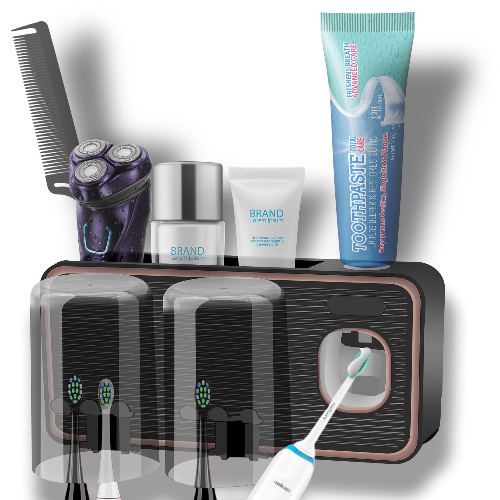 HubiCare – Soporte para cepillos de dientes con dispensador de pasta de dientes montado en la pared para baño, exprimidor automáti