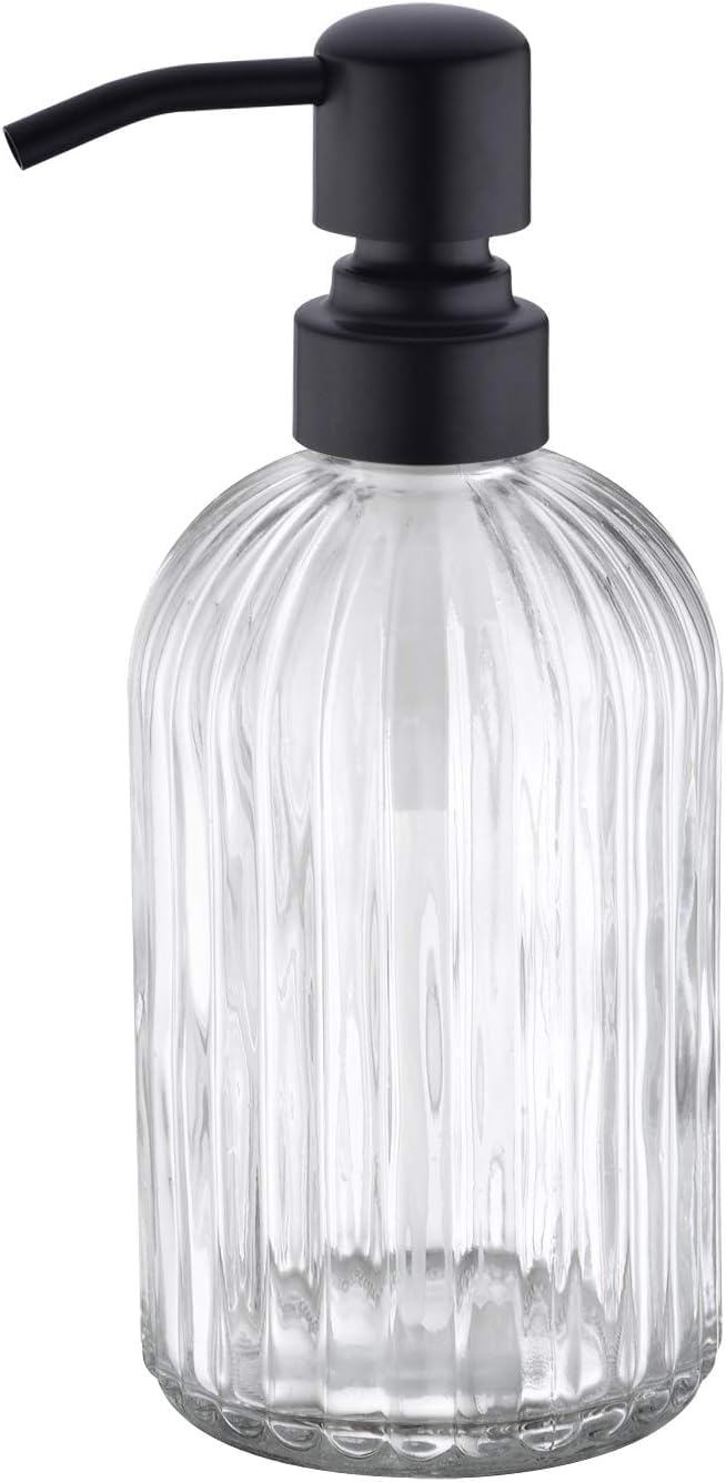 Dispensador de jabón de vidrio transparente de 16 onzas con bomba de acero inoxidable a prueba de óxido en negro mate, dispensador
