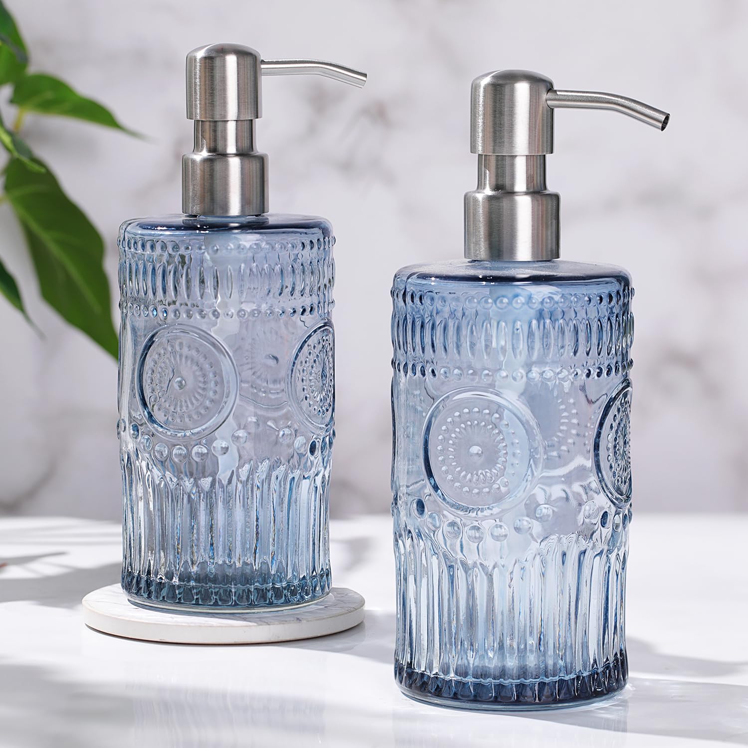 2 paquetes de dispensador de jabón de manos azul de 17 onzas, dispensador de jabón de vidrio recargable con bomba de acero inoxida