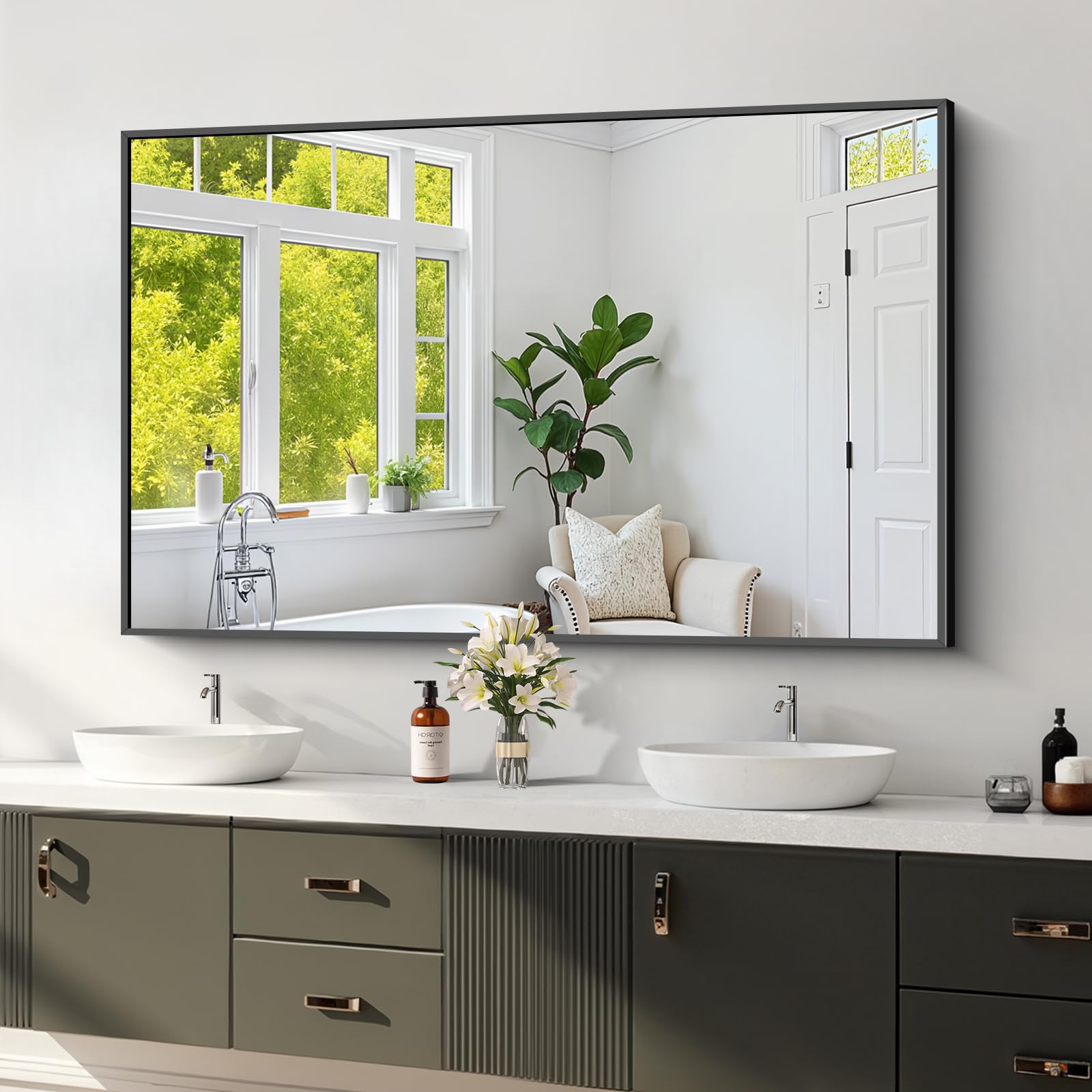 TokeShimi Espejo de baño negro, espejo de baño grande rectangular de 40 x 30 pulgadas, espejo de tocador de aluminio con vidrio te
