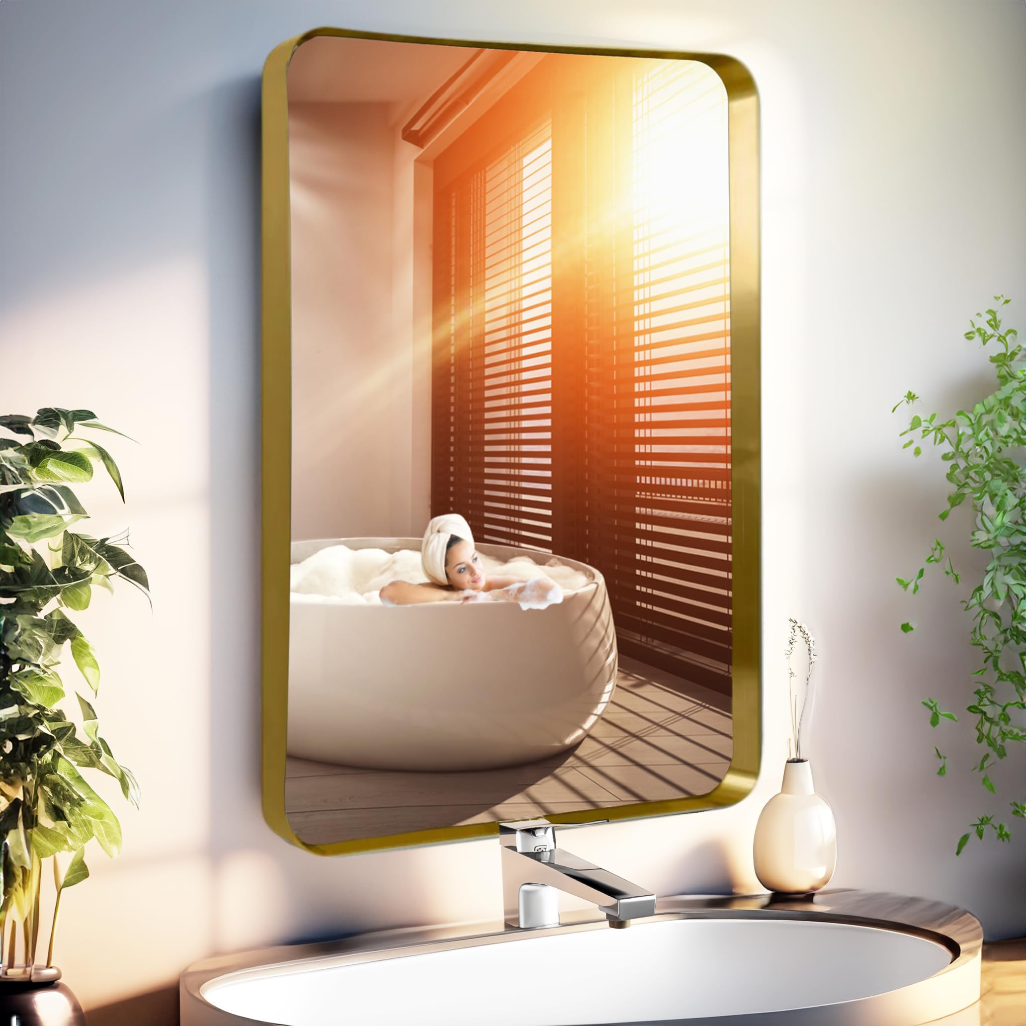 Espejo de baño dorado de 20 x 30 pulgadas para pared, moderno espejo rectangular de esquina redondeada con hierro que no se oxida,
