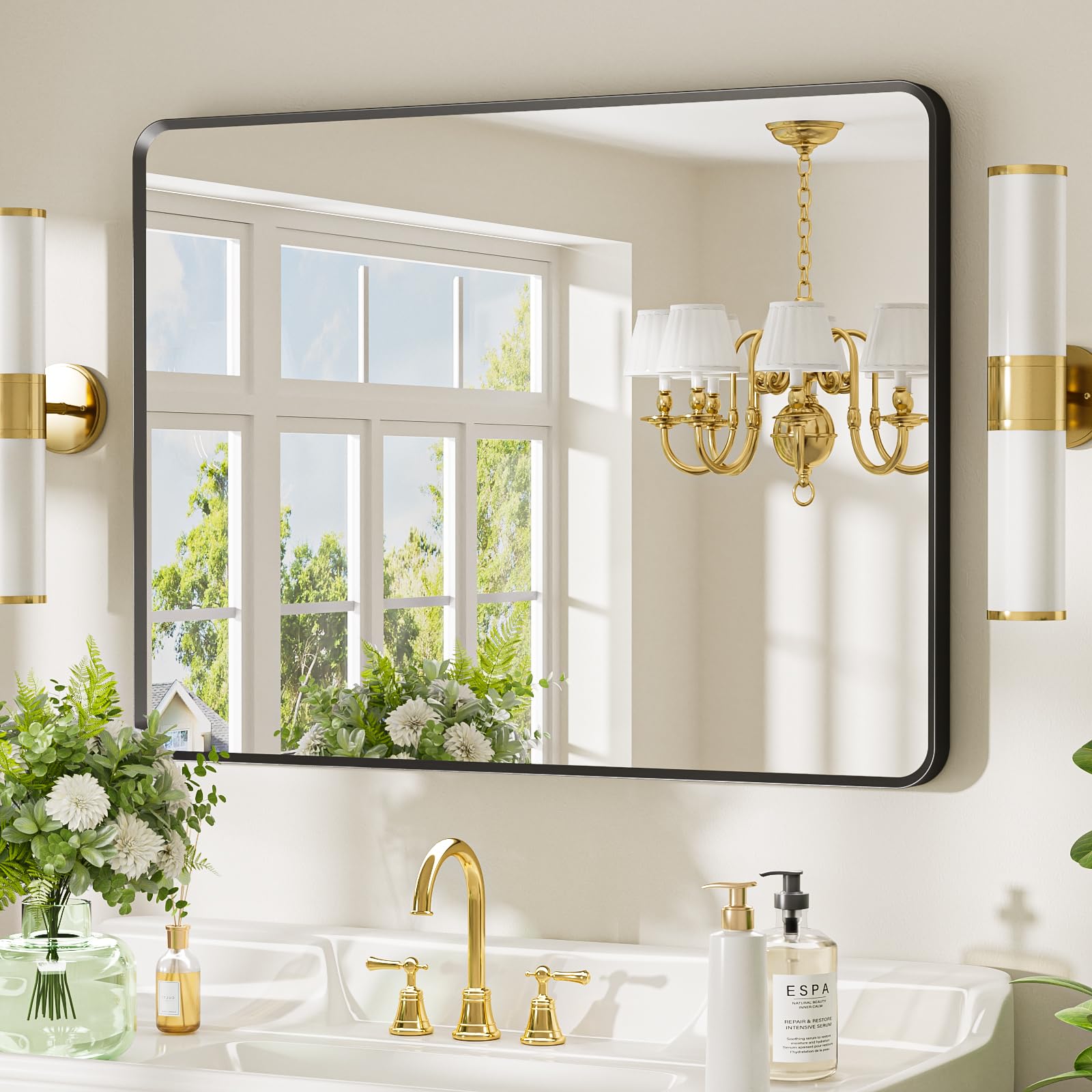 LOAAO – Espejo de tocador para baño con marco de metal negro mate de 24 x 36 pulgadas para pared, rectangular, redondeado, anticor