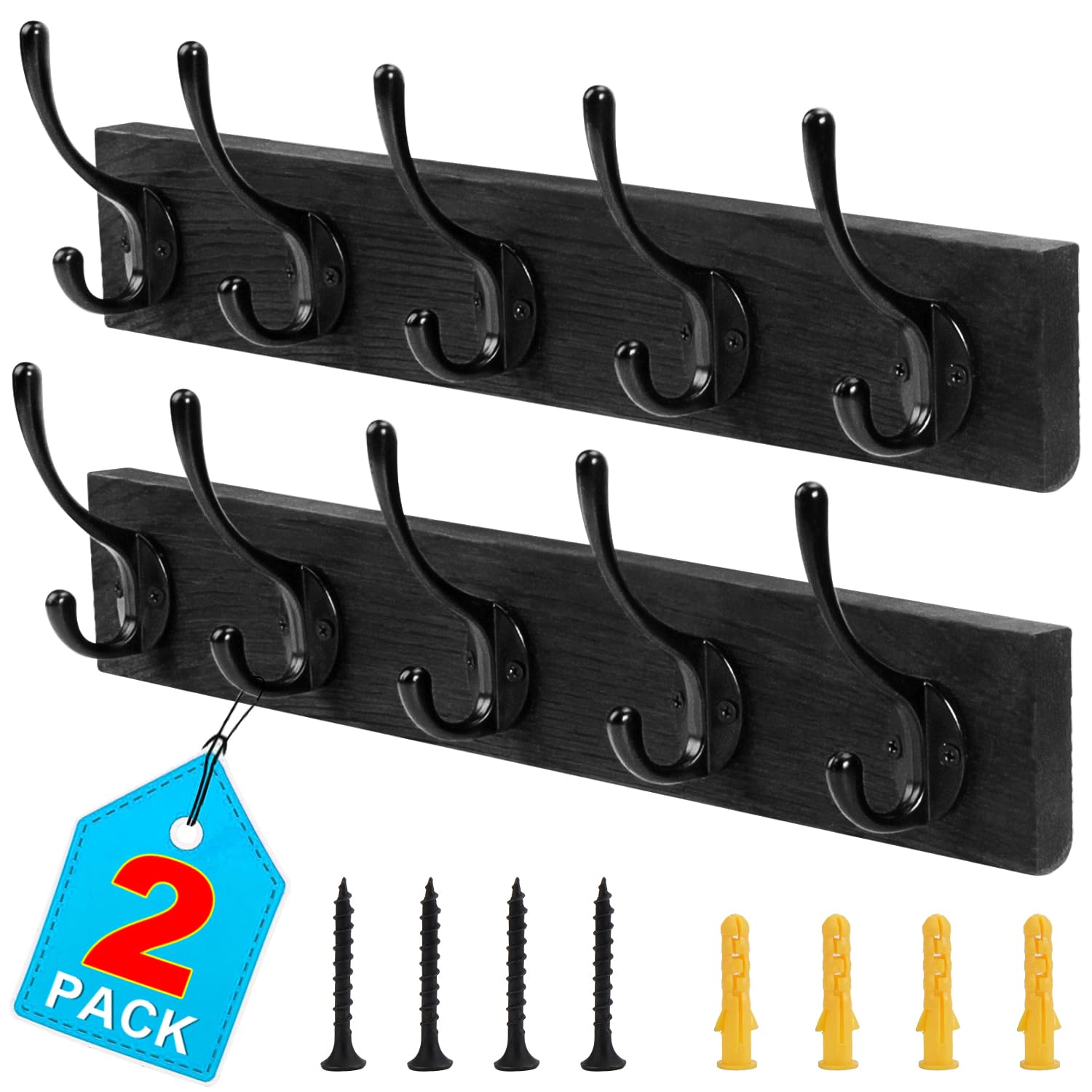 Paquete de 2 llaveros de madera de granja, estante con ganchos, perchero para montaje en pared, para entrada, baño, cocina (negro)