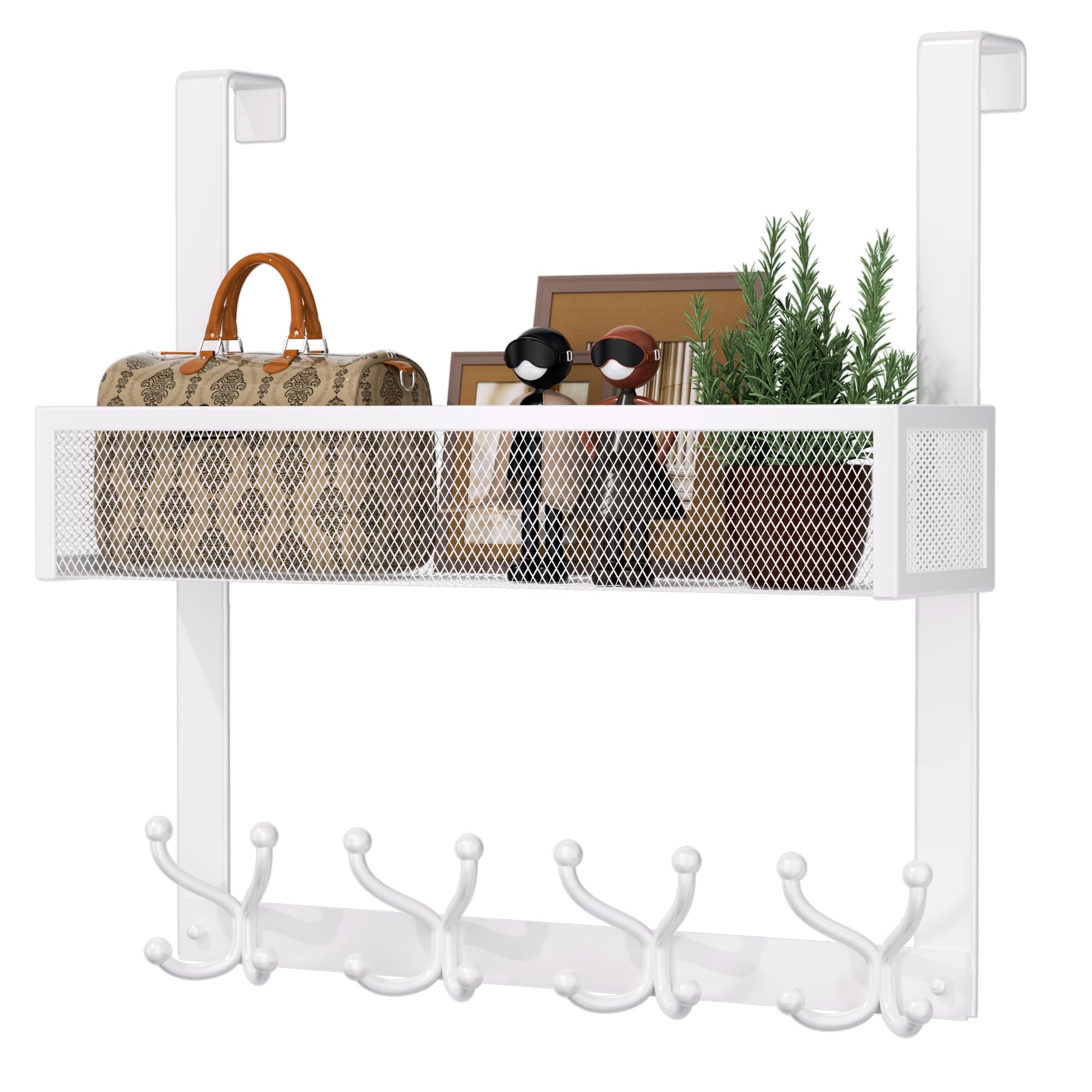 Consumest Organizador de ganchos para colgar sobre la puerta, colgador de puerta con cesta de malla y 16 ganchos para percheros, o