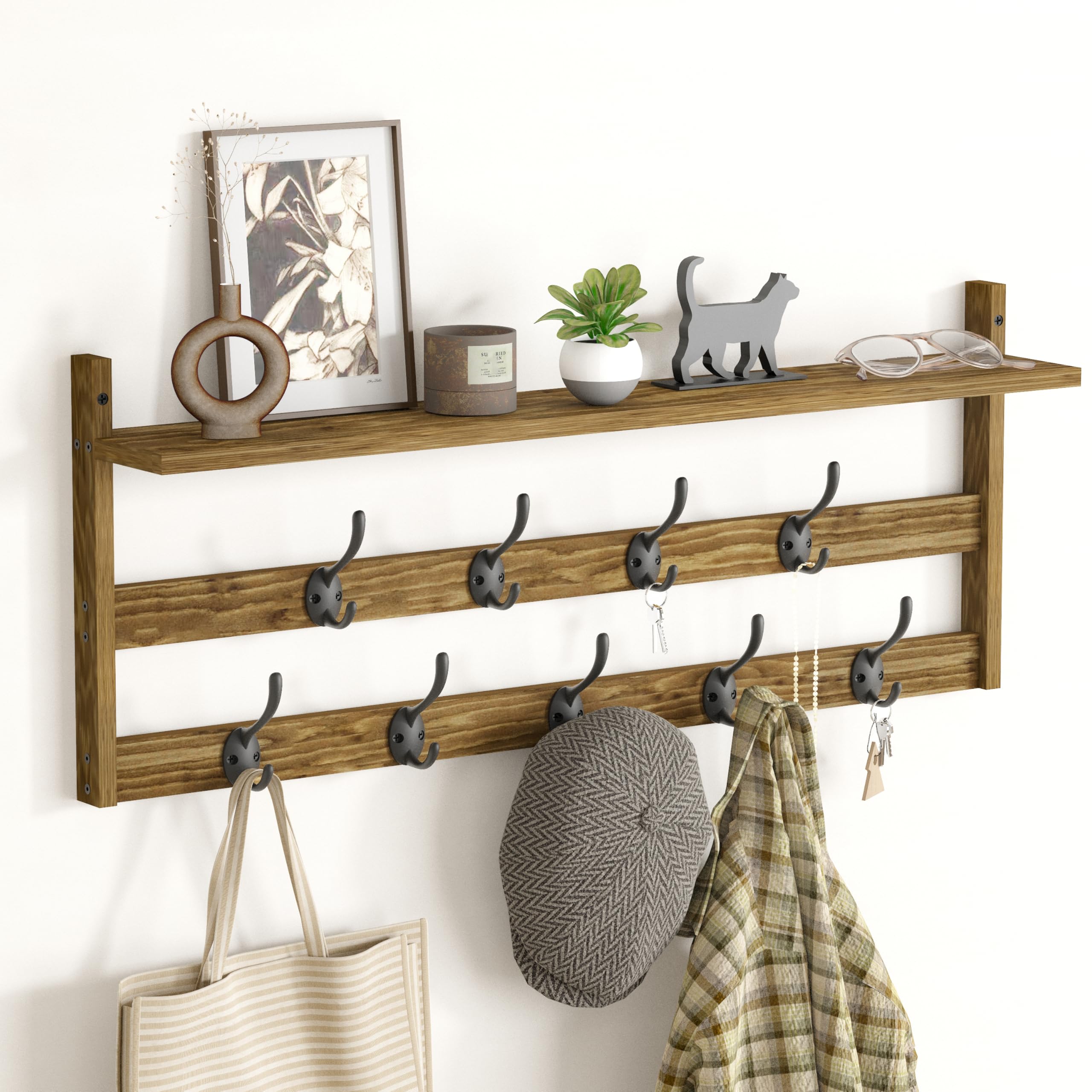 WEBI Perchero de pared con estante, 8 ganchos de clavija, estante de pared rústico de 34 pulgadas de largo con ganchos debajo para