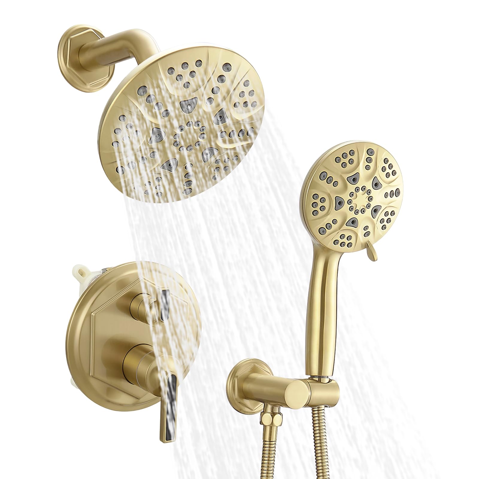 BWE Juego de grifos de ducha de oro cepillado, sistema de ducha montado en la pared, cabezal de ducha de lluvia de 6.1 pulgadas, c