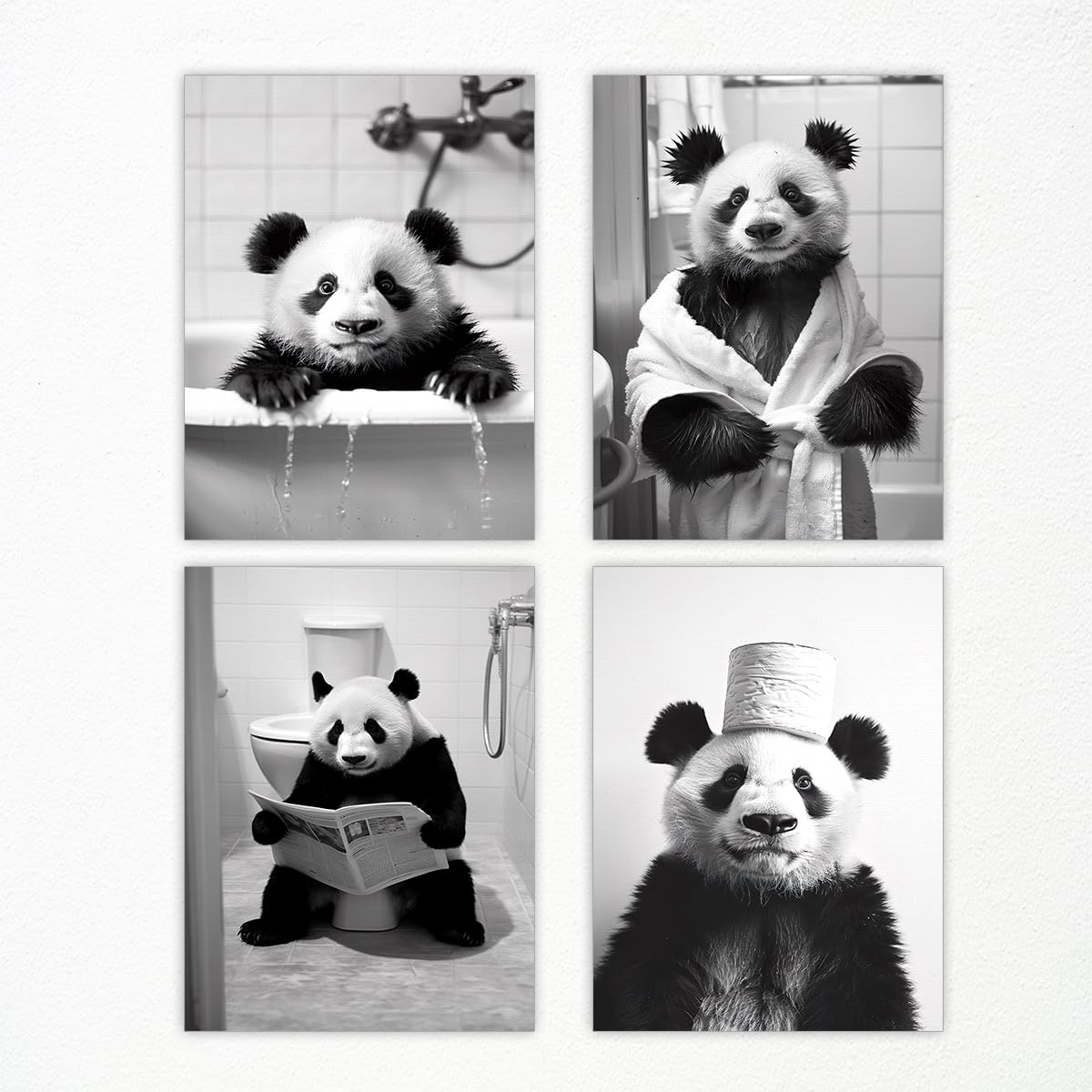Lienzo decorativo de panda para baño, divertido póster de baño de animales, juego de 4 lindos pandas en el inodoro, imágenes de pe