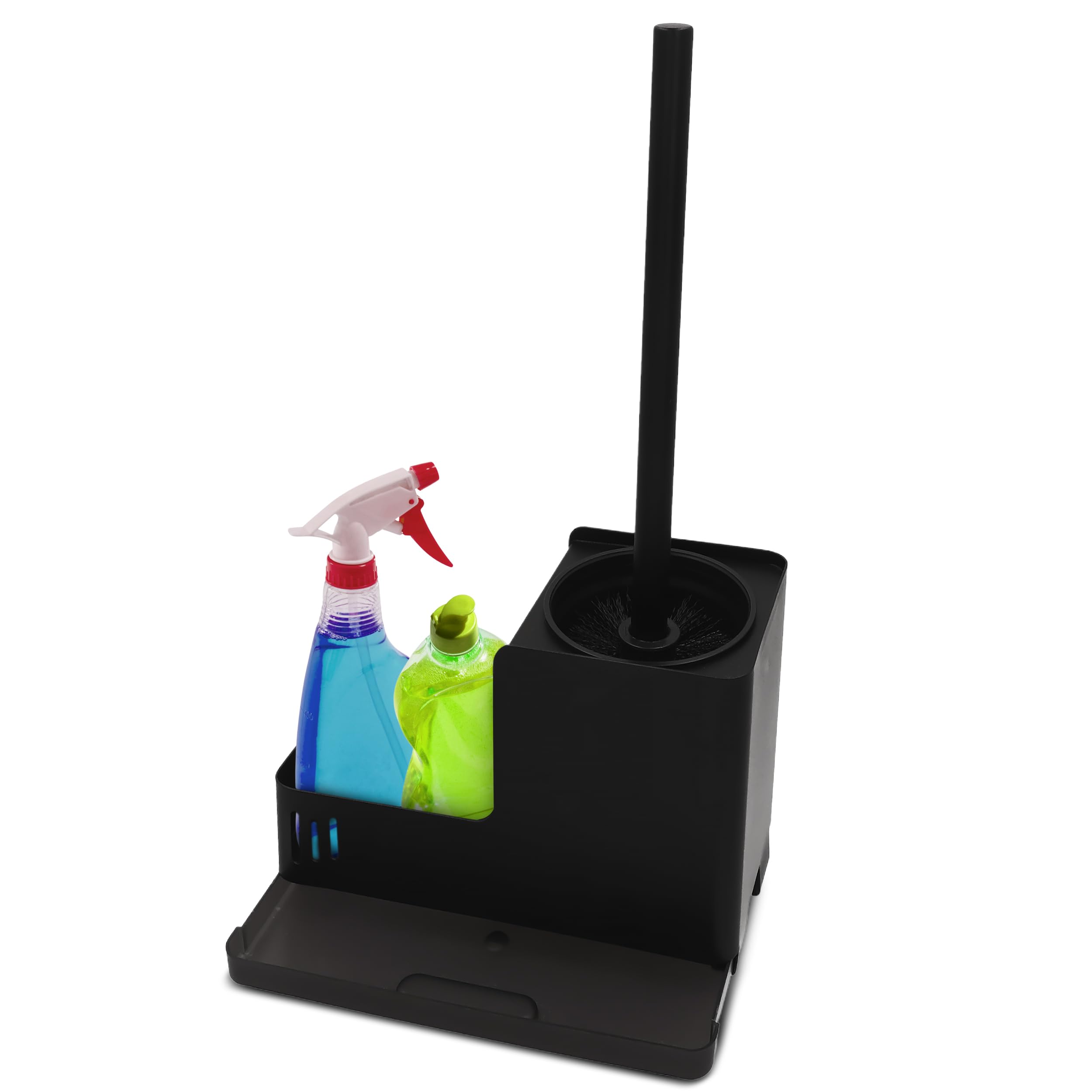 Juego de escobilla y soporte de inodoro negro, soporte para escobilla de inodoro montado en la pared con bandeja y compartimento p