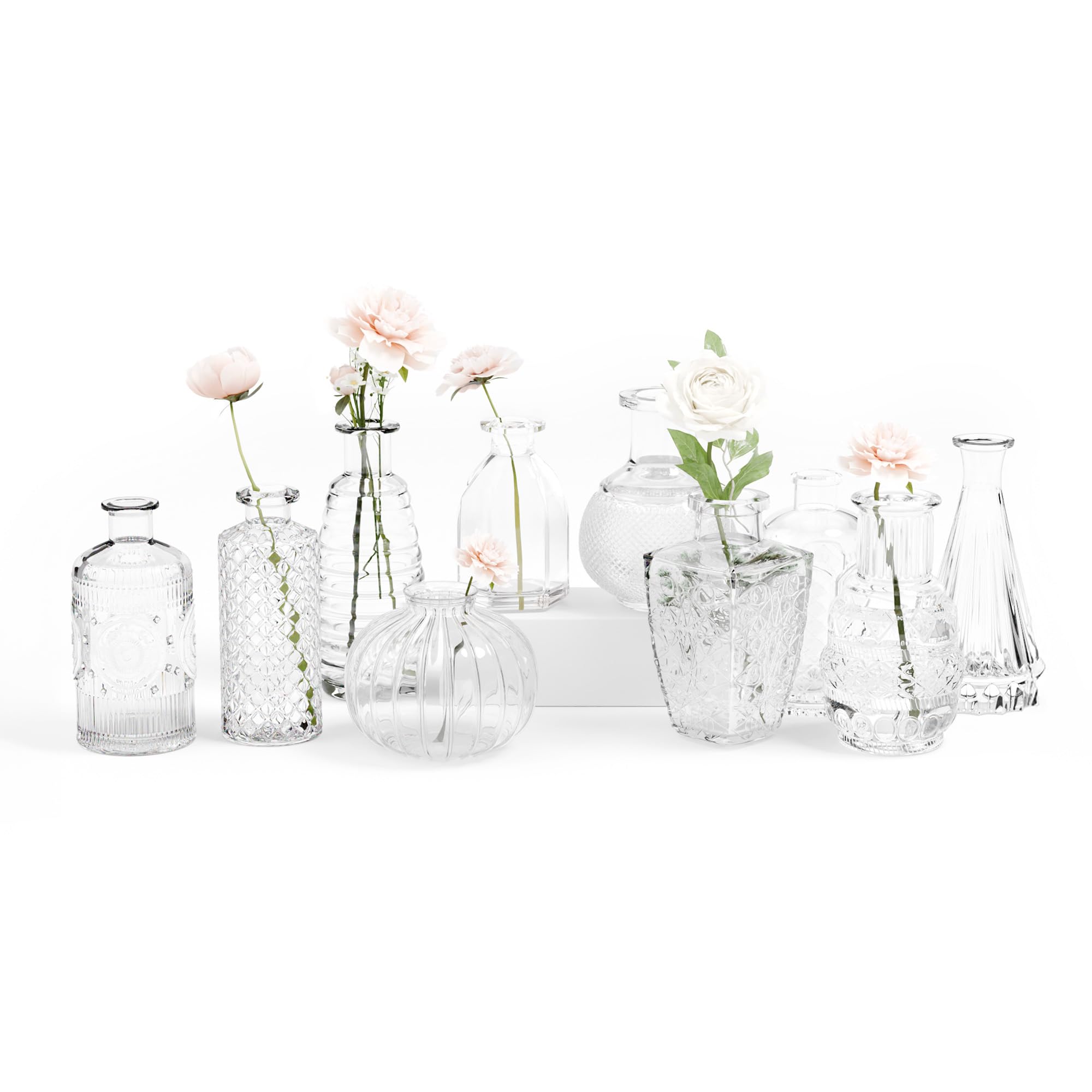 Gather & Bloom Creations Jarrones pequeños de cristal para centros de mesa, juego de 10 jarrones transparentes a granel con formas