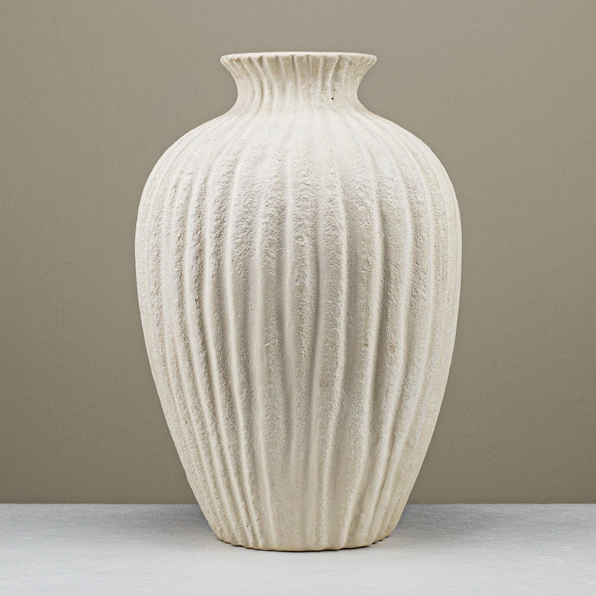 Jarrón decorativo de cerámica hecho a mano – Florero redondo de 10.4 pulgadas con textura rústica blanca cálida con ondas irregula