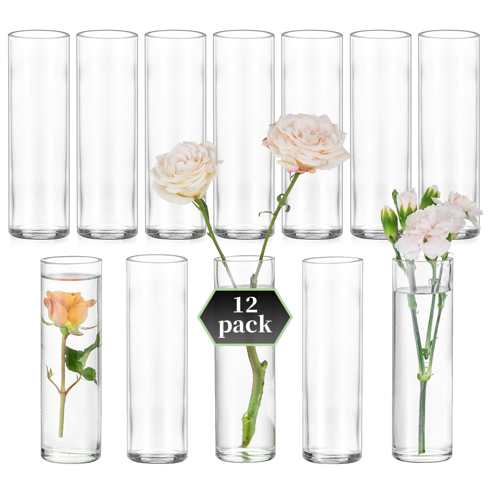 Jarrones de cristal cilíndricos pequeños para centros de mesa: Glasseam Juego de 12 jarrones modernos para mesa de boda, decoració