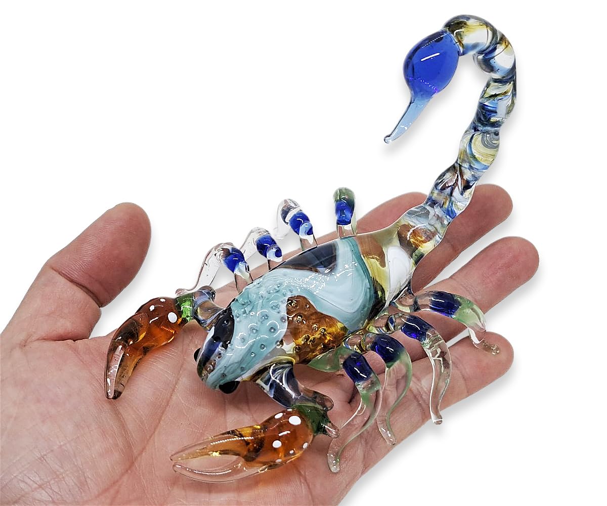 WitnyStore Pequeña figura de escorpión azul y marrón de 4 pulgadas, en miniatura, escorpiones de vidrio soplado a mano, artrópodos