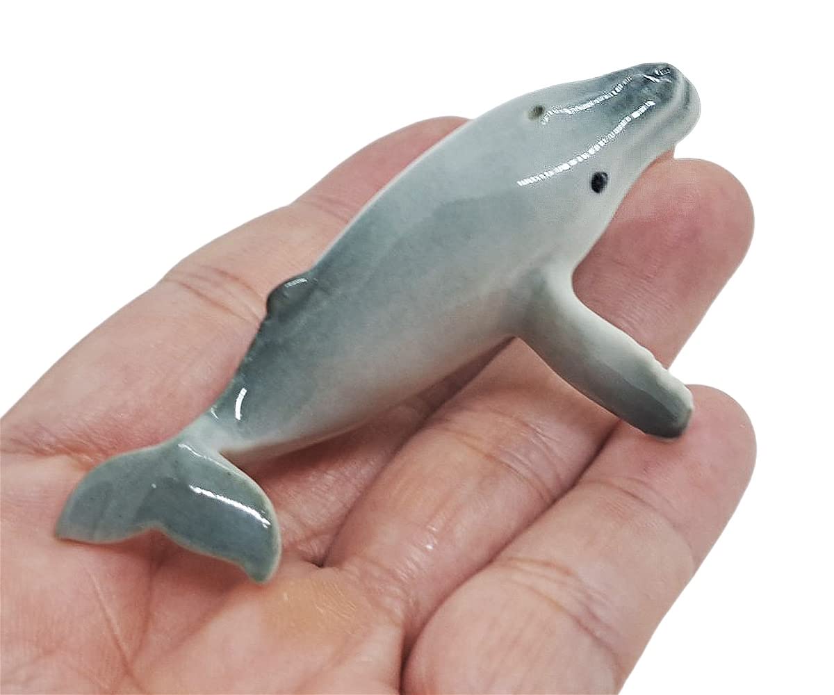 WitnyStore Pequeña figura de ballena jorobada de 2¾ pulgadas de largo, hecha a mano, pintada a mano, peces de cerámica y mamíferos