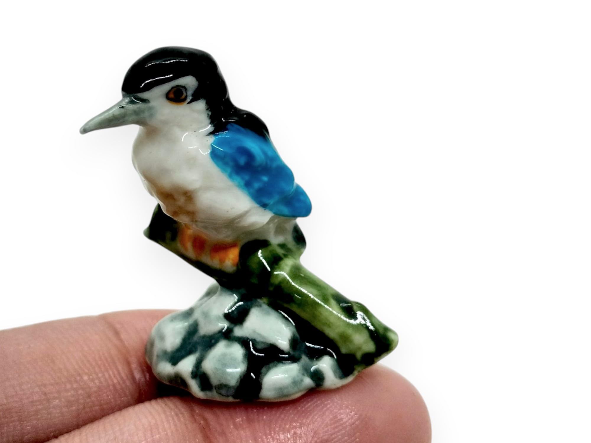 WitnyStore Pequeña figura de pájaro martín pescador de 1 pulgada de largo en rama de bambú, hecha a mano, pintada a mano, pájaros
