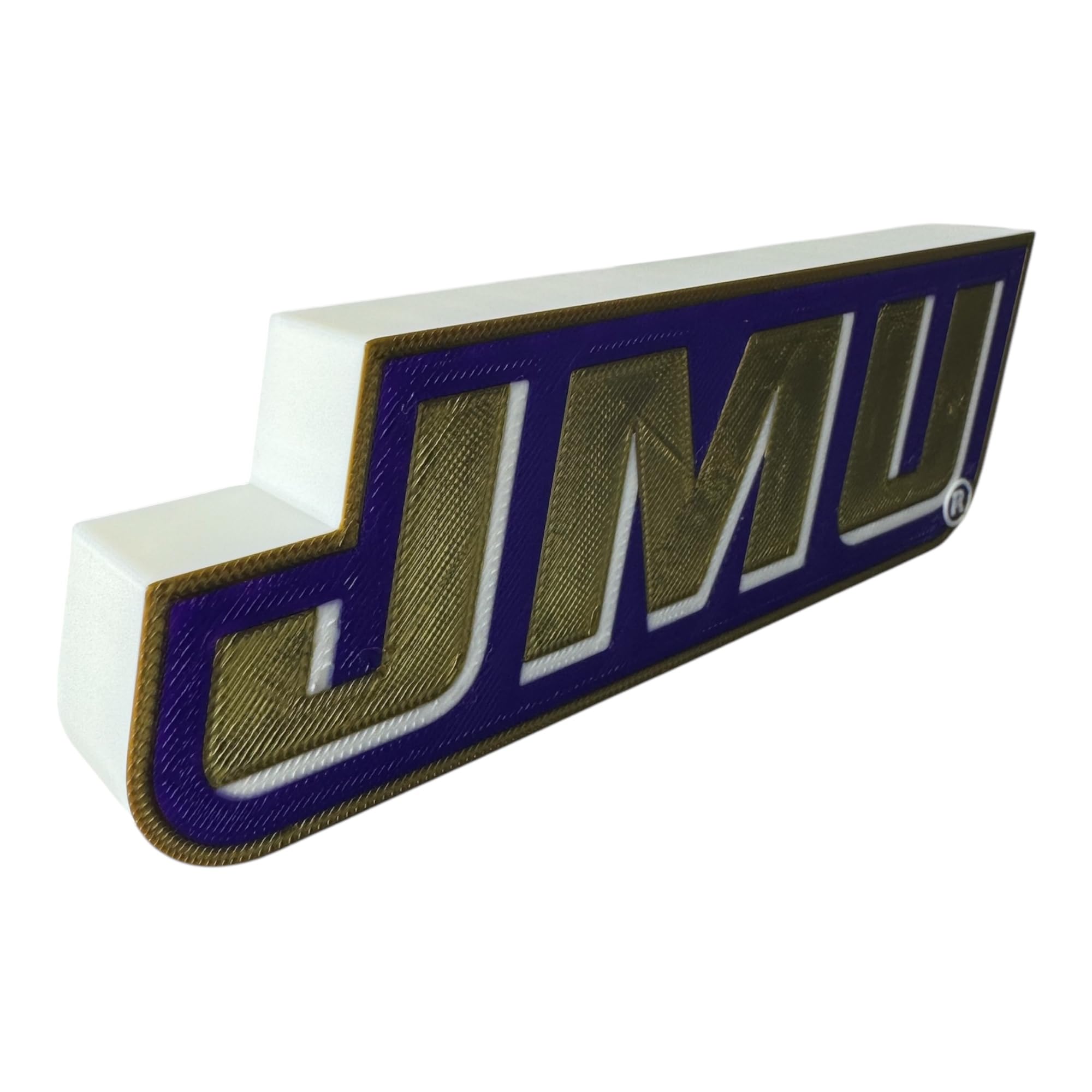 Logotipo decorativo impreso en 3D de la Universidad James Madison, figura de exhibición independiente, blanco/morado/dorado, decor