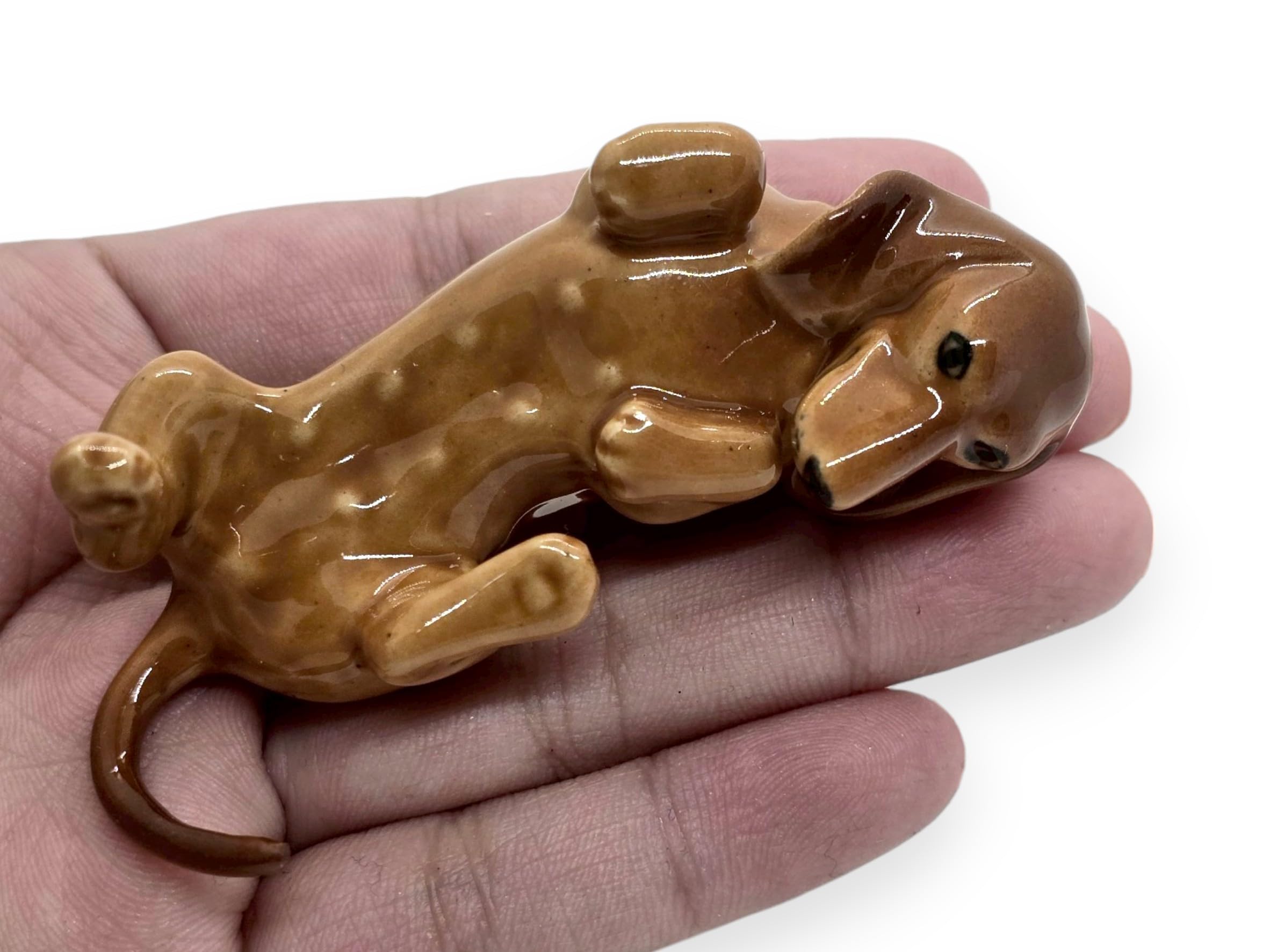 WitnyStore Tiny 3″ Brown Dachshund Lying on Back Wiener German Dog Figurine – Miniature Hand Made Painted Ceramic Dogs Puppy Canin