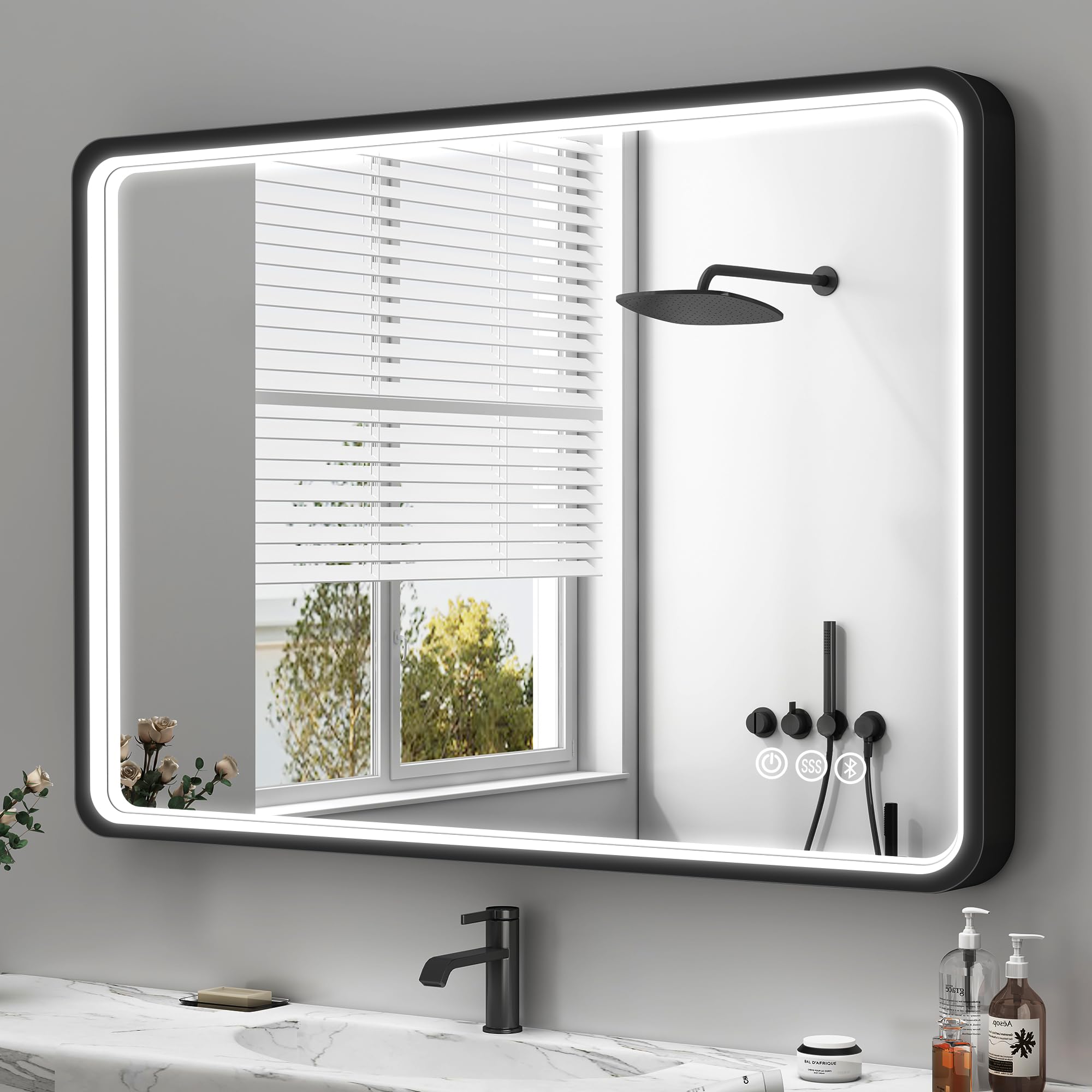 Amorho Espejo de baño LED de 40 x 36 pulgadas con marco negro, luz frontal y retroiluminación, regulable continuamente, antivaho,