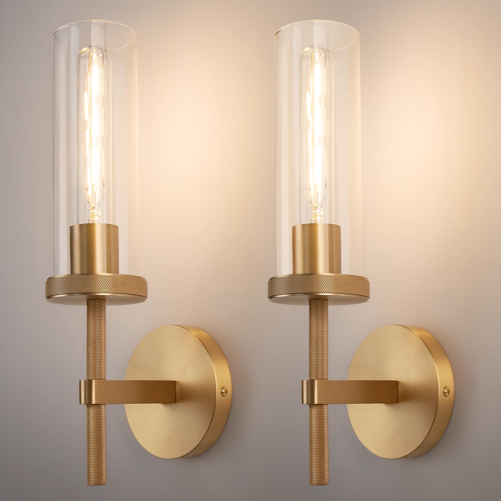 Juego de 2 apliques de pared de latón moleteado de 15 pulgadas, accesorios dorados para tocador de baño con tubo de vidrio transpa